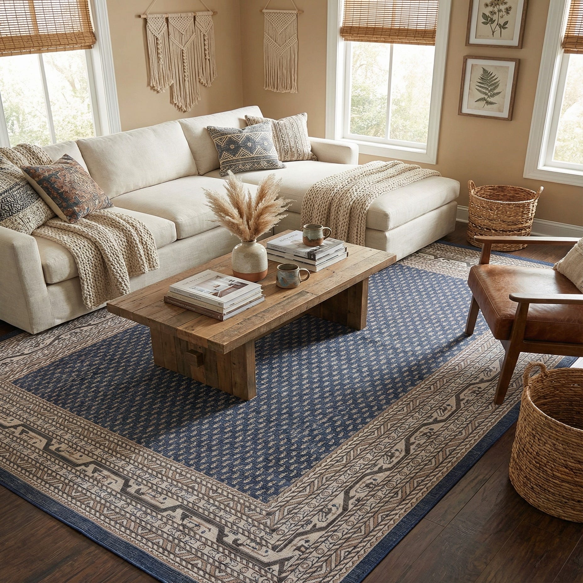 Machine-made of 100% polypropylene, the construction holds fine detail and lies flat beneath furniture. Pair it with warm wood tones and brass accents for a refined transitional living room, place it under a dining table to ground an open-plan space, or use it to bring color and pattern into a home office or bedroom with neutral furnishings. Its blue background and neutral accents also work well in coastal, nautical, or modern farmhouse schemes where layered textures and calm color palettes are key.