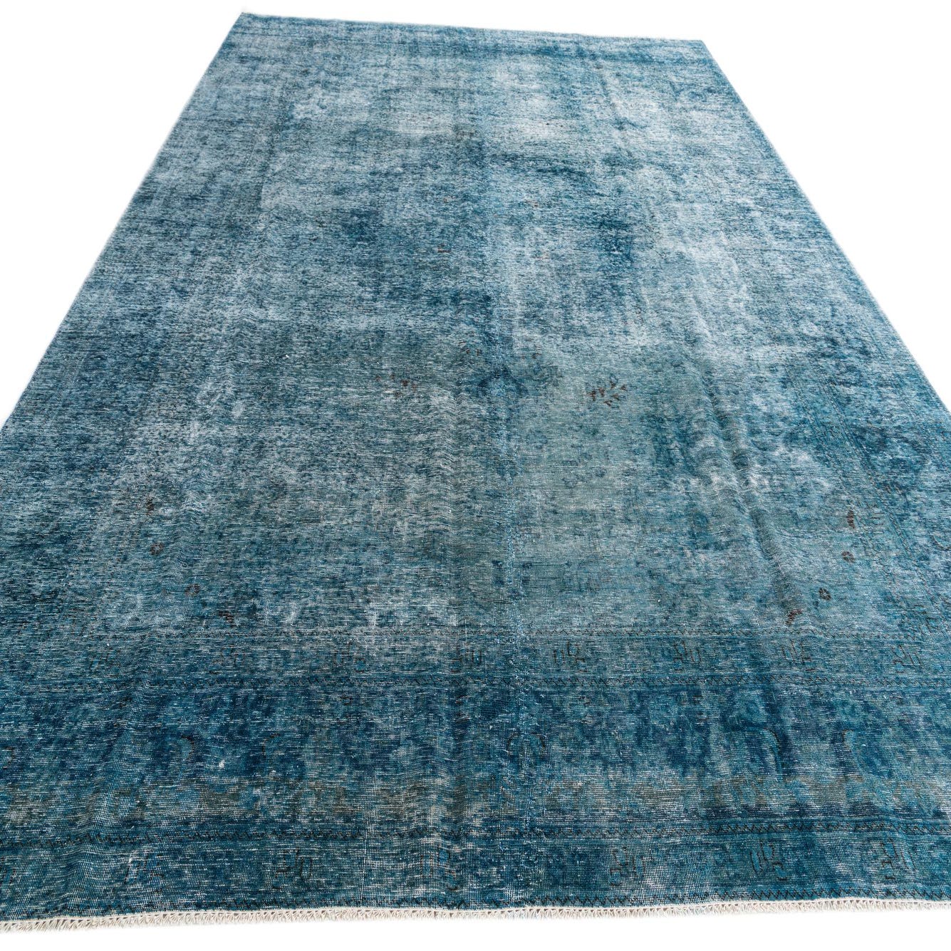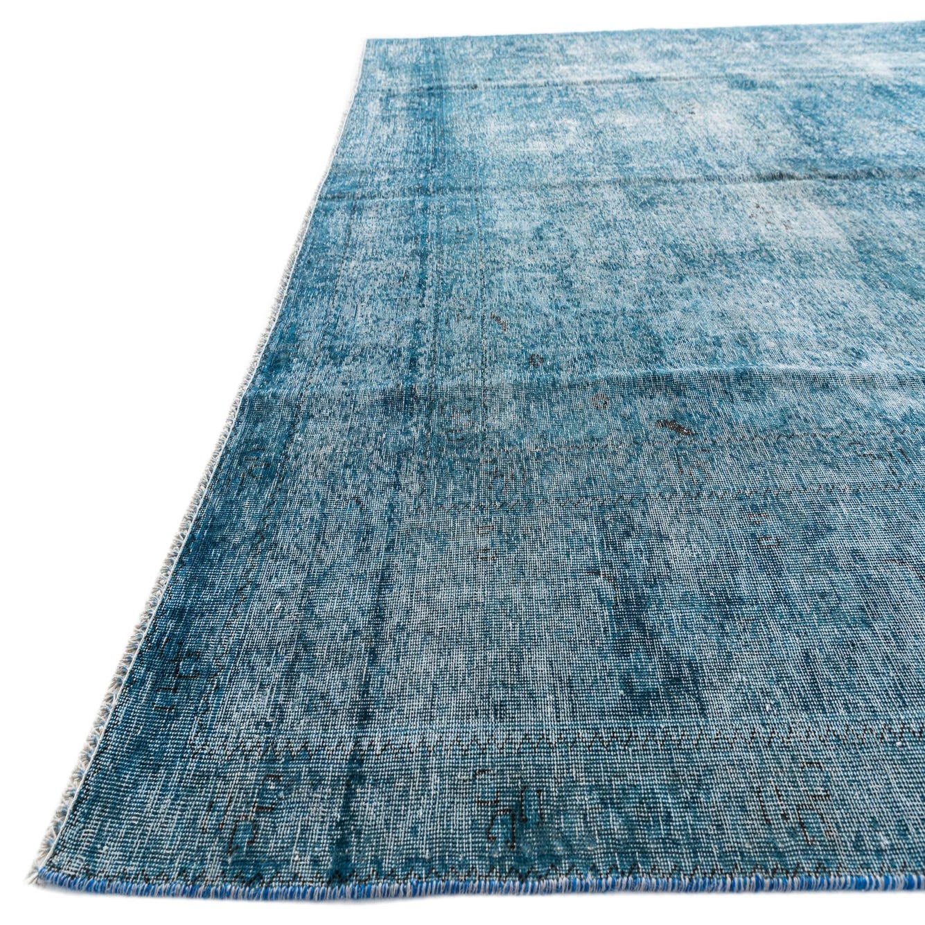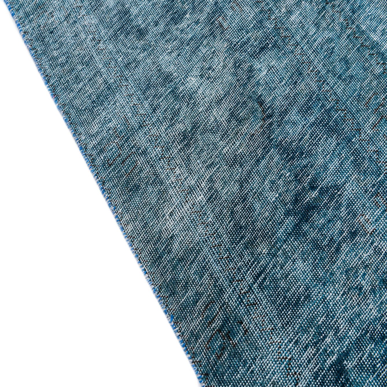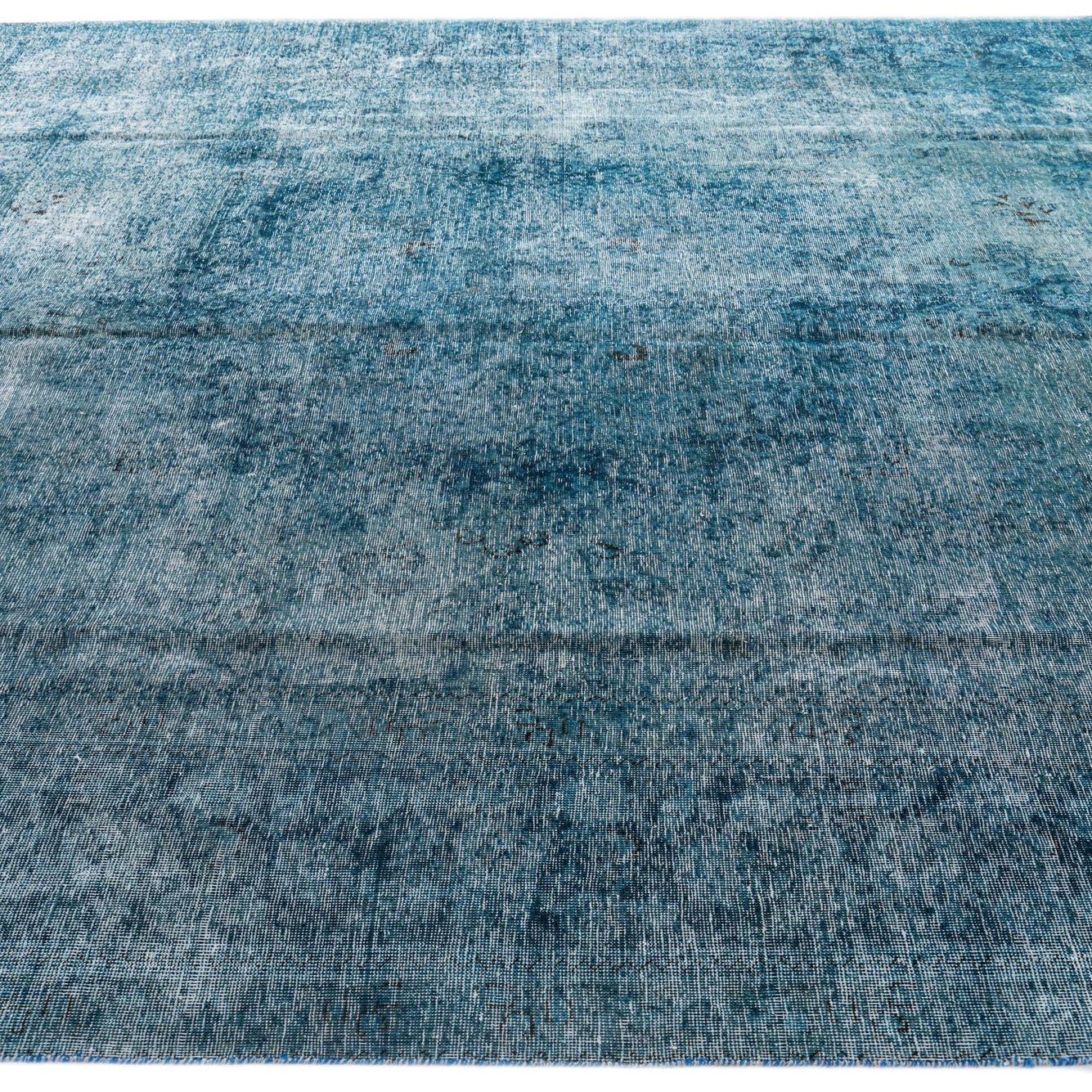 A hand-knotted, 100% wool piece with a softly distressed, low-contrast pattern, this rug has a layered blue background accented by deeper navy blue and scattered ivory highlights. The design keeps traditional motifs nearly faded into the field, with a subtle border and the faint suggestion of a central medallion visible through the overdyed surface. Underhanded light brings out a gentle nap and a soft sheen—the dense wool pile feels supple to the touch while showing slight variations that give the rug a lived-in, vintage character.