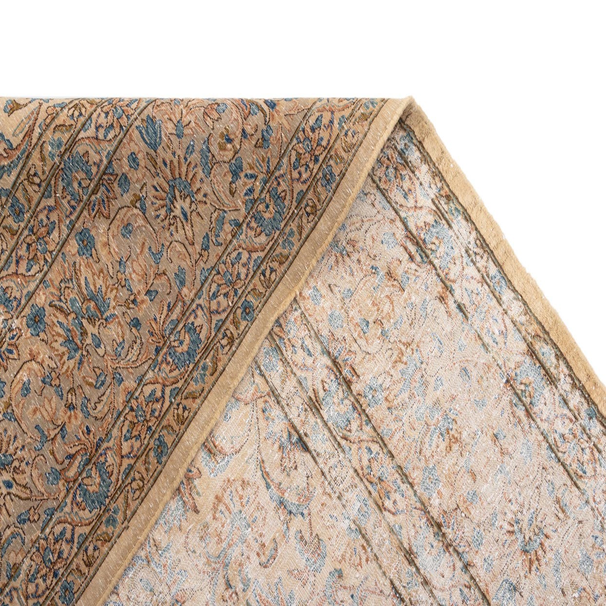 Hand made of 100% wool, this rug presents a gently aged, traditional pattern set on a blue background. An all-over floral and arabesque design weaves cream, beige, grey and green into delicate medallions and scrolling vines, while a faintly defined border frames the field. The wool pile has a soft, slightly plush hand with subtle tone variation from the distressed finish, so it reads as both comfortable underfoot and visually light in a room.