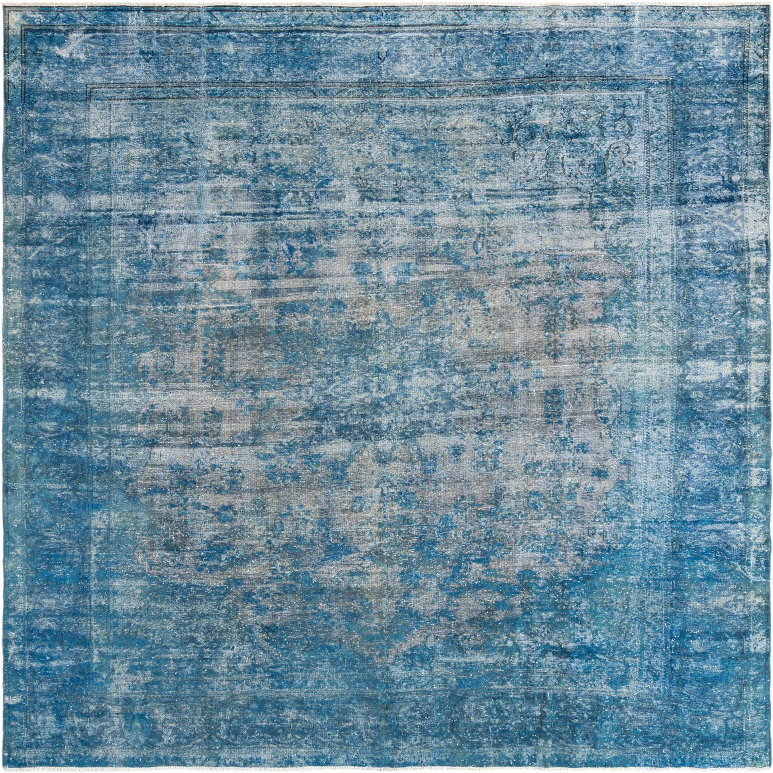 A 10x13 rectangular blue Persian area rug with a distressed, vintage look and subtle traditional patterns.