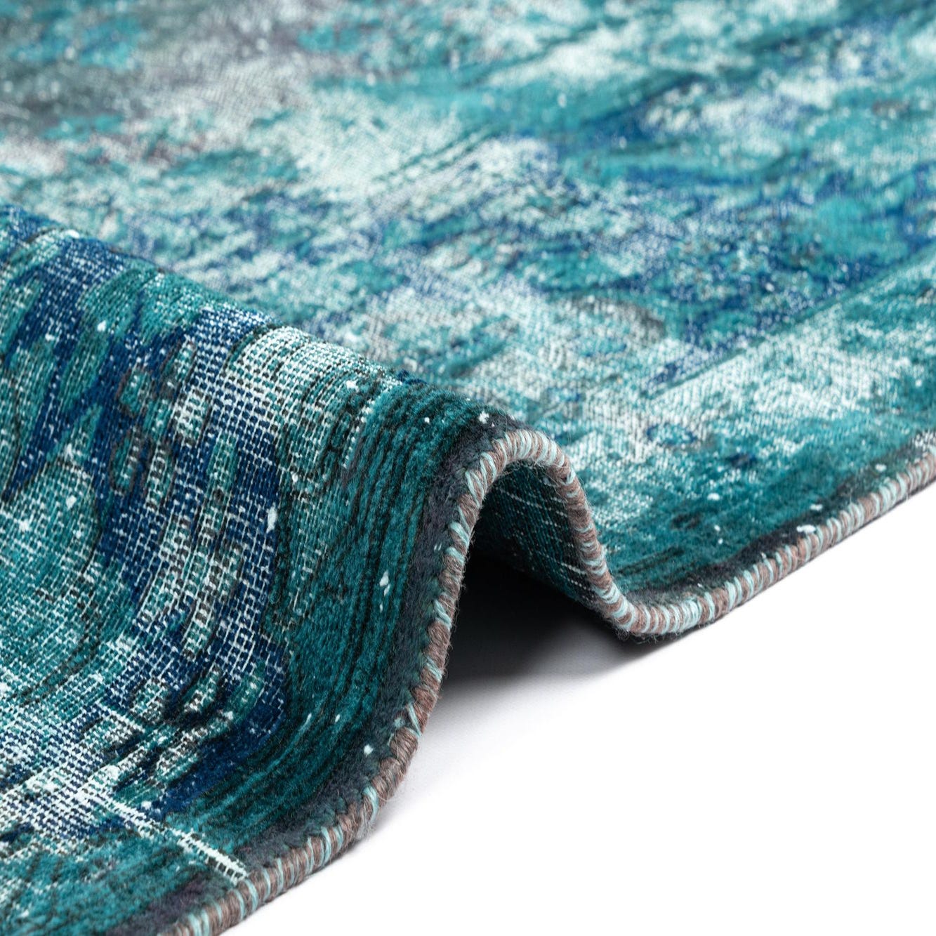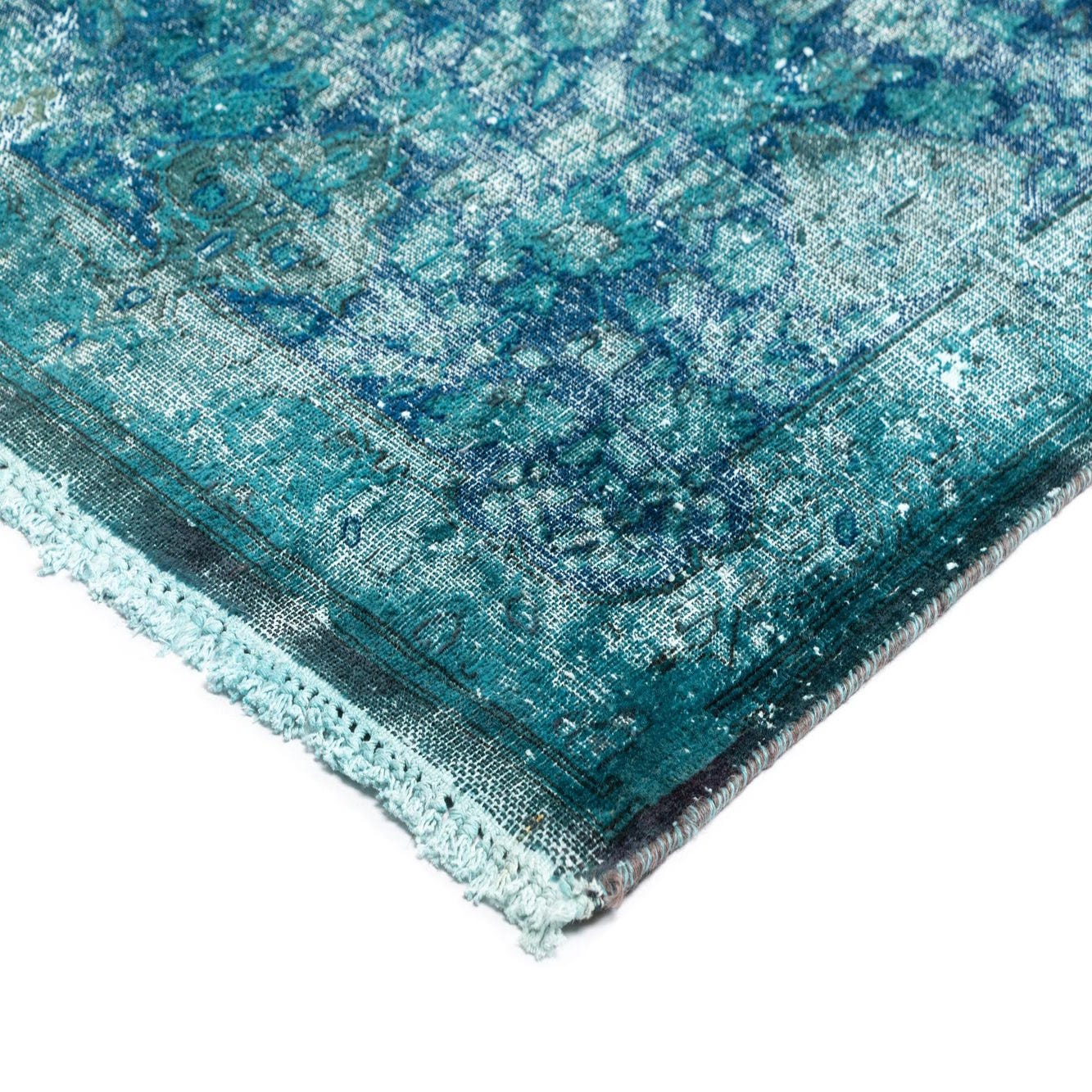 A 10x13 rectangular Rugs.com Vintage Royal Persian rug in varying shades of blue, featuring a distressed traditional pattern with a central medallion.