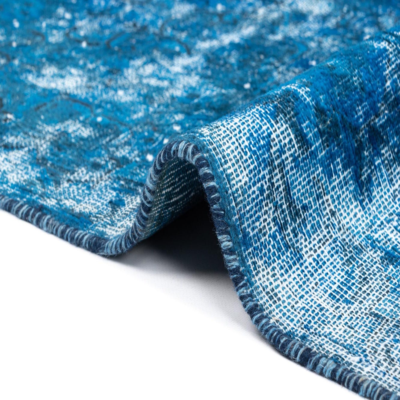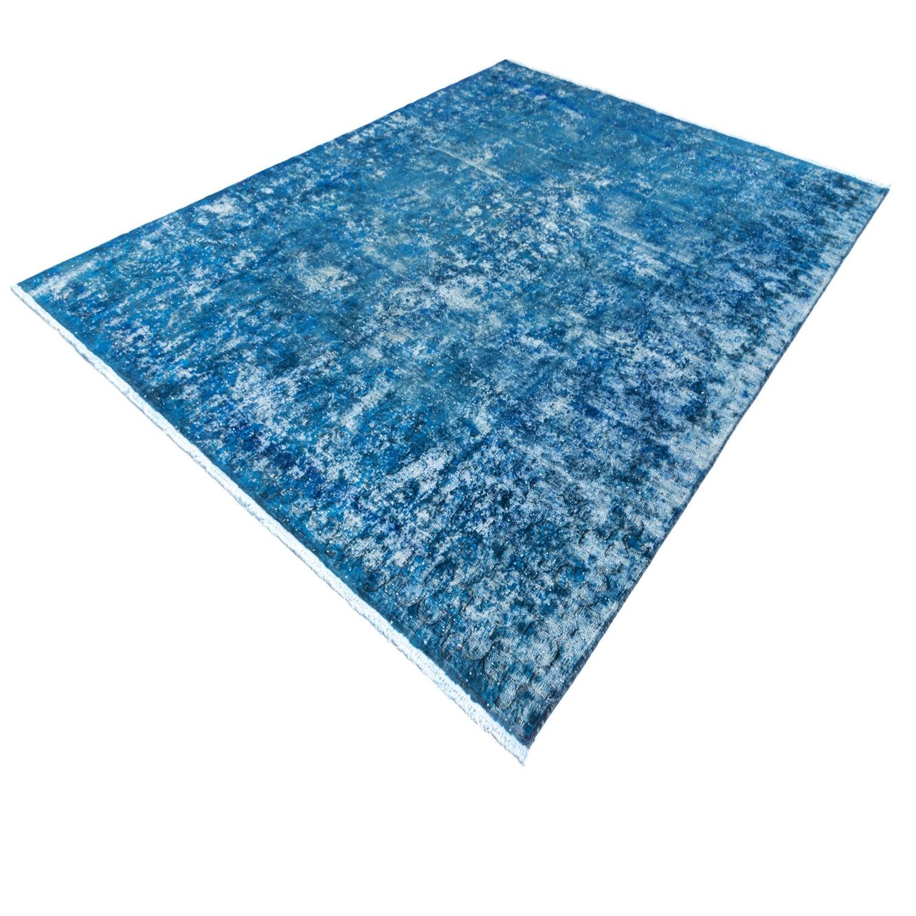 A 10x13 rectangular blue Persian rug with a distressed, vintage-inspired pattern, ideal for a living room.