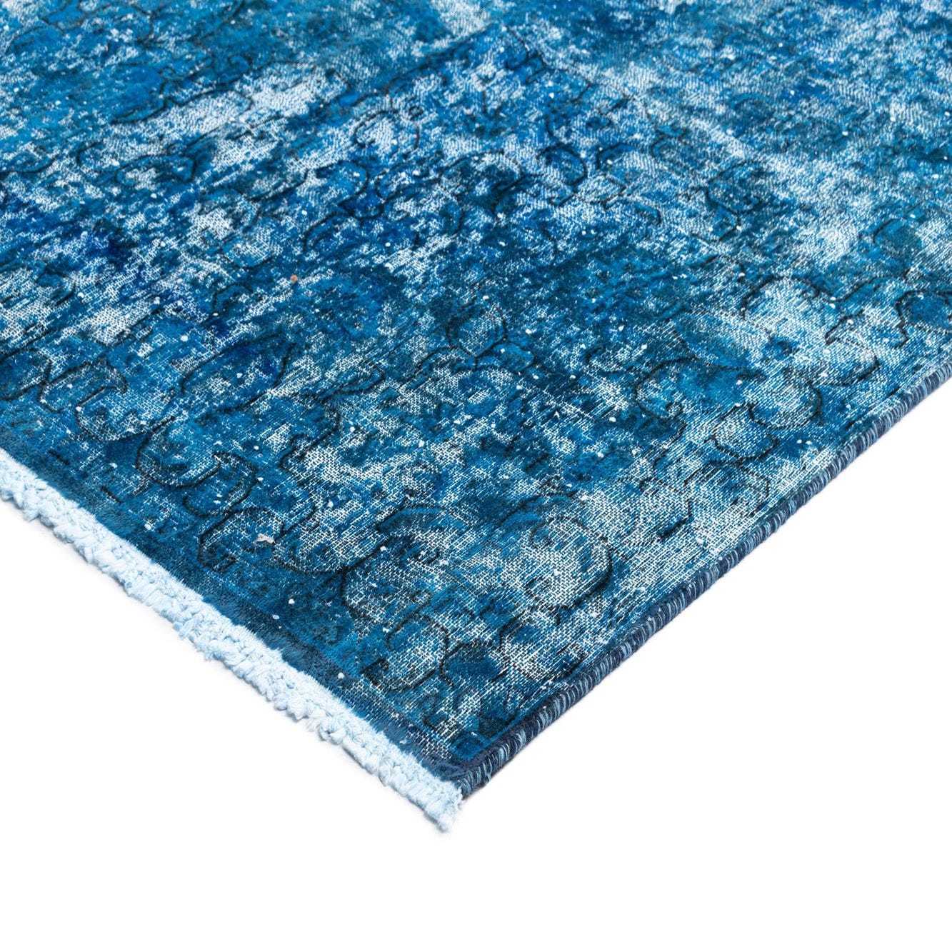 The Vintage Royal collection rug is a hand-made piece crafted from 100% wool, sized at a generous 10x13 feet, perfect for larger rooms. The design showcases a dynamic array of blue hues, including blue, dark blue, and complementary accents of white and black that add depth and dimension to the pattern. This rug's blue background is overlaid with a distressed motif, contributing to its vintage allure.