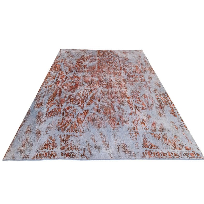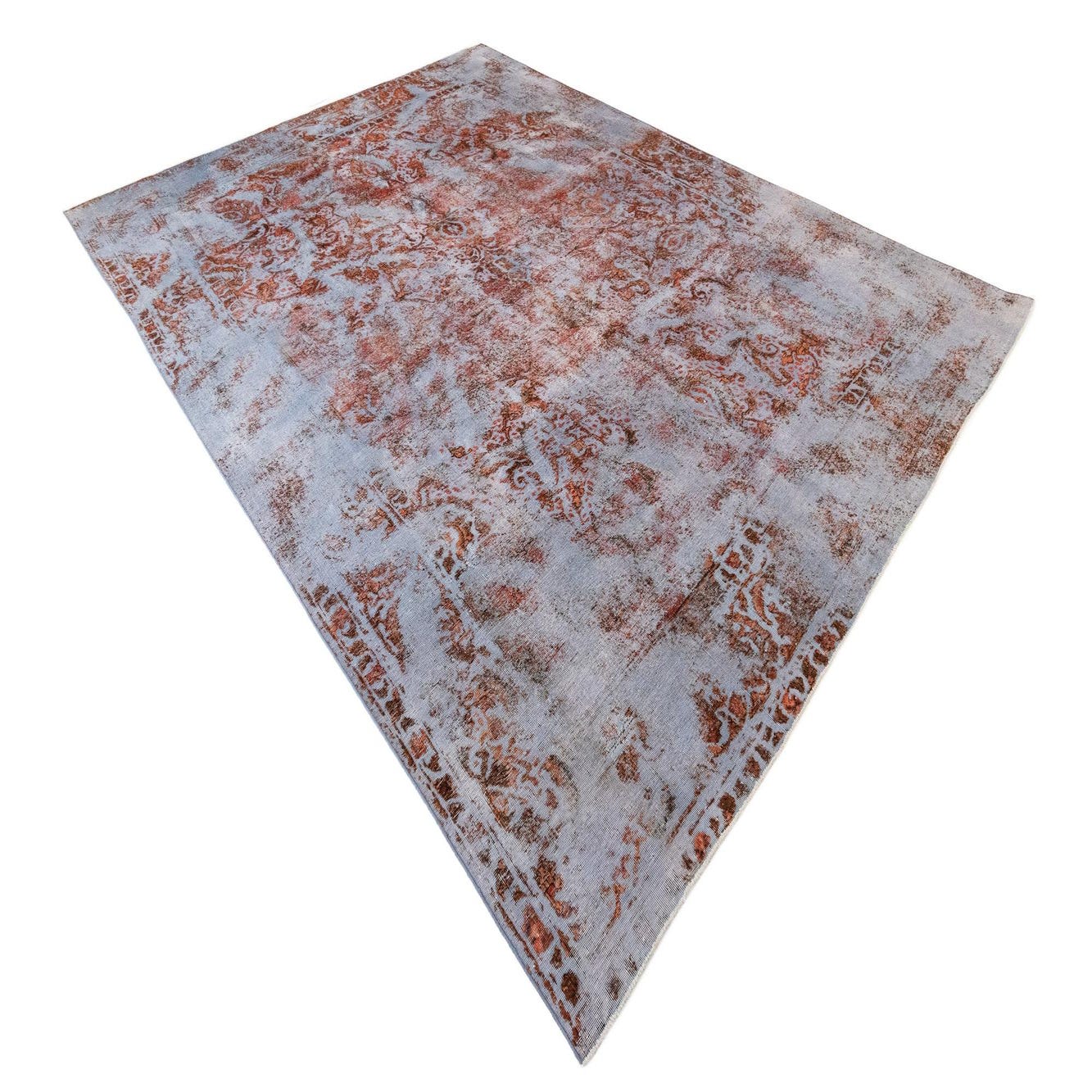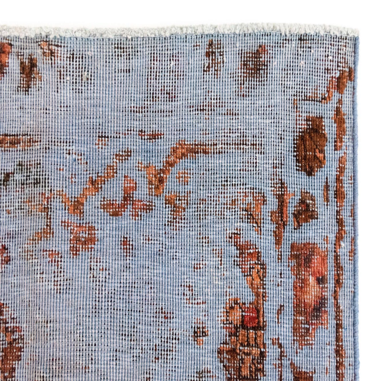 A 10x13 rectangular blue Persian area rug with an intentionally distressed, faded red and orange floral pattern.