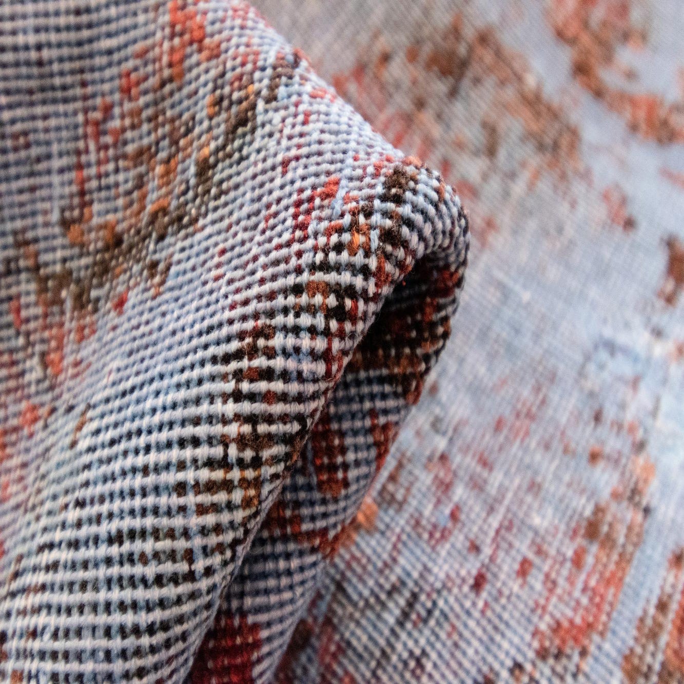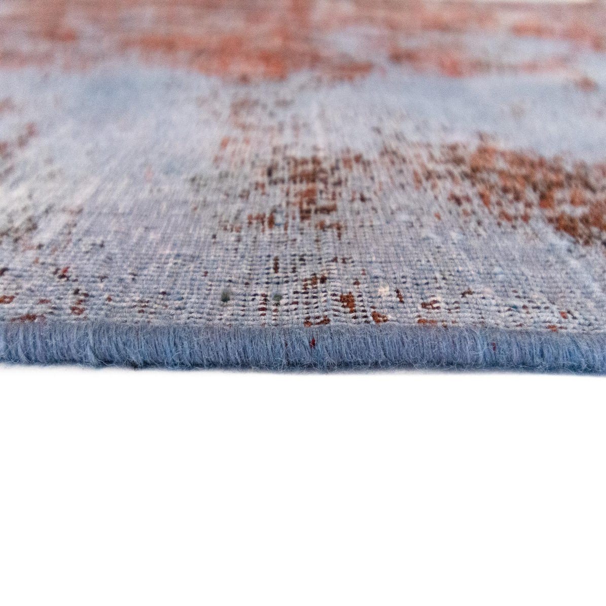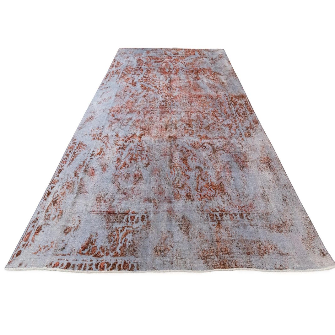 A 10x13 rectangular blue Persian area rug with an intentionally distressed, faded red and orange floral pattern.