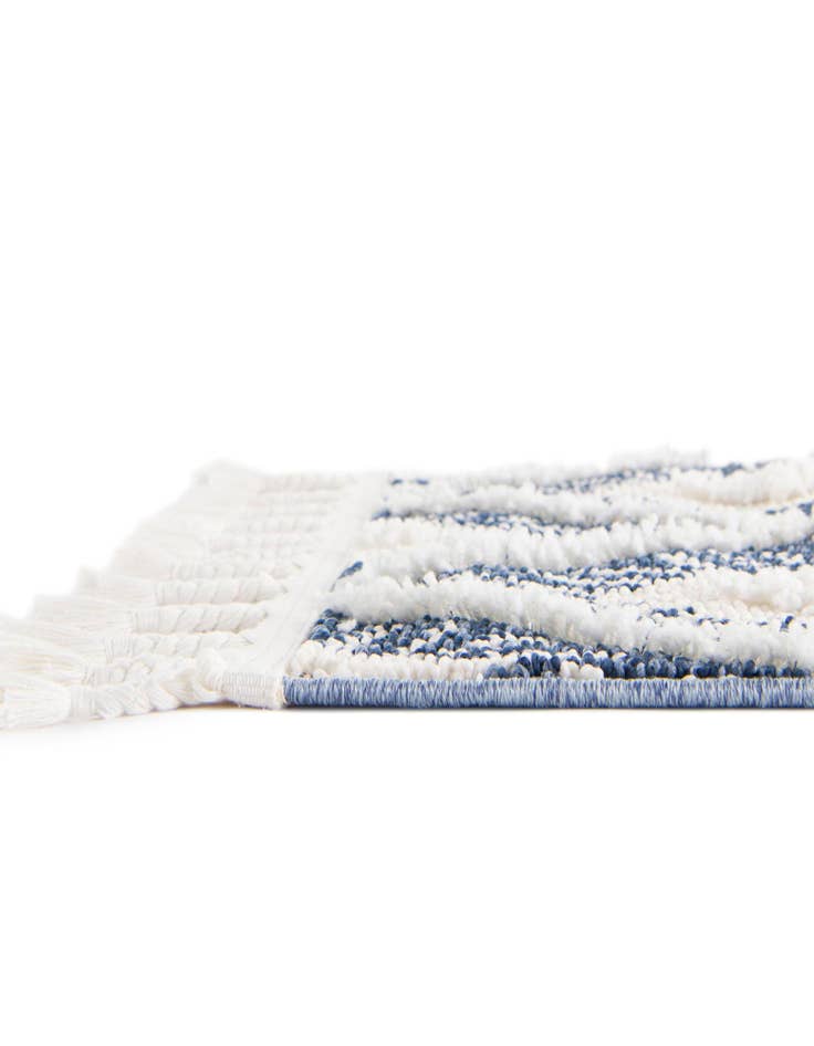 Machine-made from 100% polyester, the rug has a low-profile pile with a subtly sculpted texture where the ivory motifs sit slightly higher than the blue field, adding gentle dimension underfoot. The fringe edges add a relaxed, casual touch. Place it beneath a low-profile sofa to define a seating area, layer it under a dining table to introduce pattern without overwhelming the space, or pair it with light woods and white linens for a coastal or modern farmhouse feel. It also works well in contemporary and transitional interiors where a graphic pattern and soothing palette are desired.