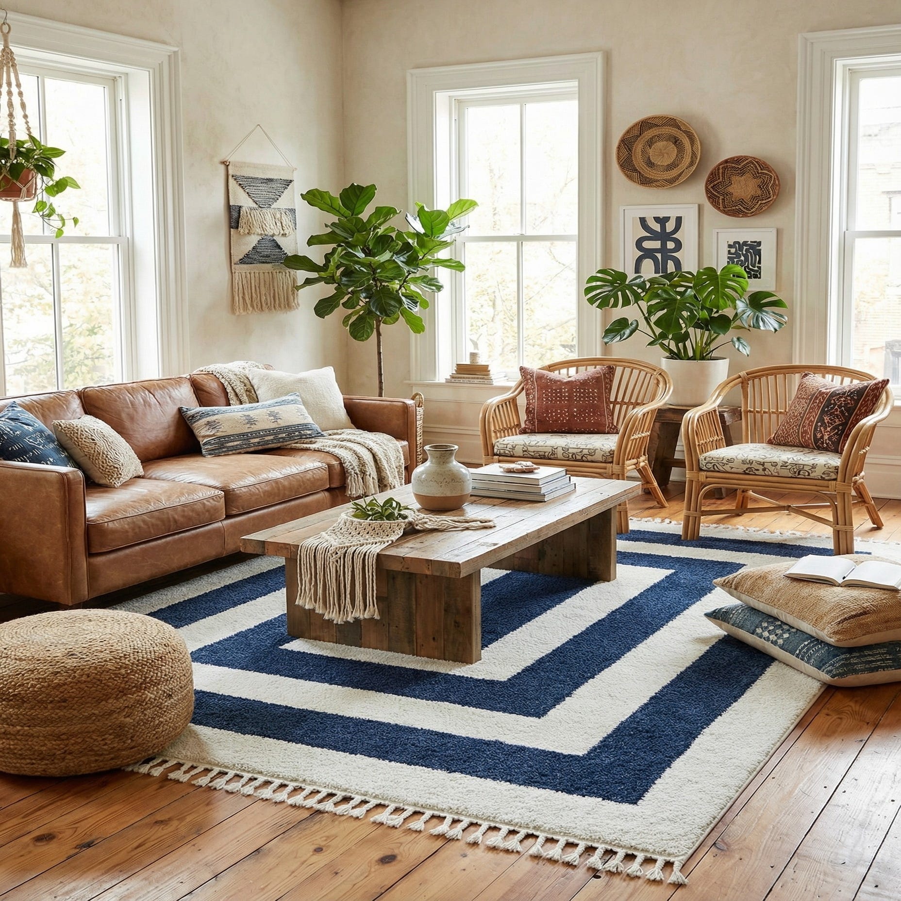 Given its design and color scheme, this rug would integrate seamlessly into a minimalist setting, supporting a clean and crisp interior, or serve as a statement piece in a more eclectic room that features a mix of patterns and textures. The clean lines and contrasting colors could also harmonize with a nautical theme, complementing other blue and white décor elements.