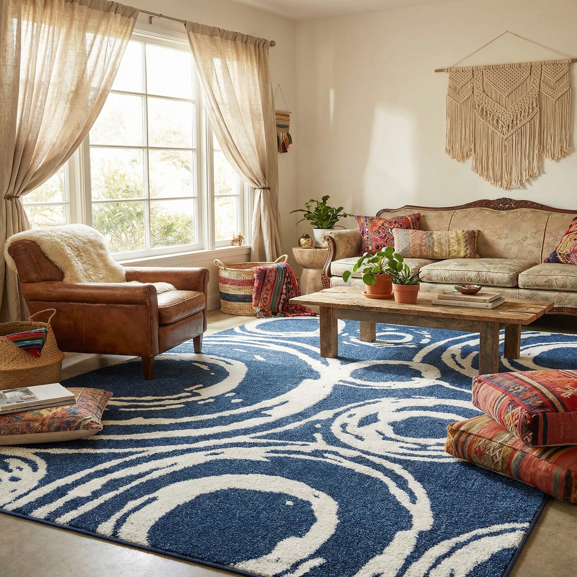 In terms of interior design scenarios, this rug works well in contemporary spaces that embrace modern art influences or in bohemian-style rooms that play with layered textures and eclectic accessories. It could also complement a coastal-themed decor, where the cool blues echo the tones of the sea.