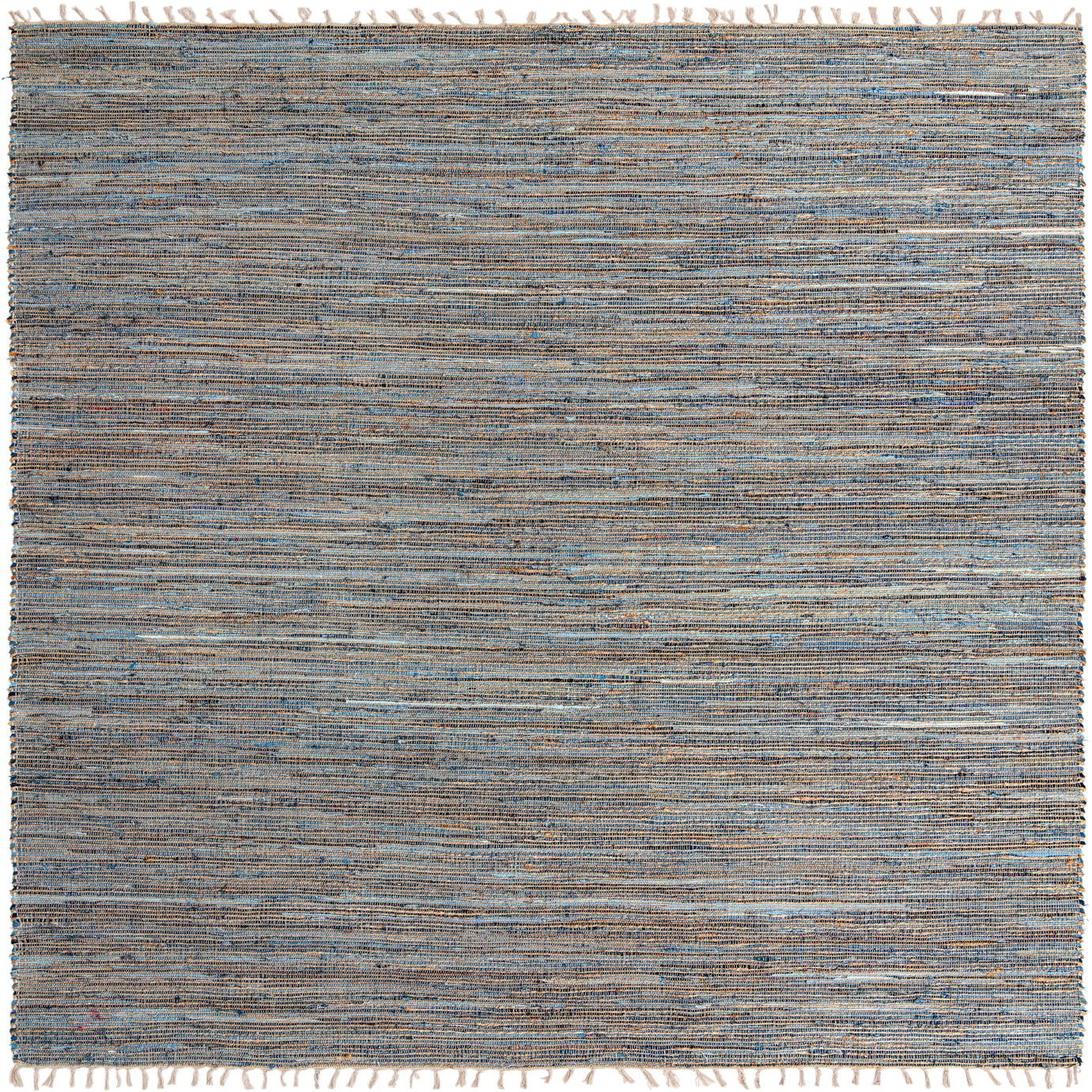 A low-profile, hand-woven flatweave that blends cotton ribbons with natural jute for a casually layered look. Narrow, irregular horizontal stripes in a blue ground are punctuated by natural and neutral flecks, creating subtle movement across the surface. The alternating cotton and jute threads produce a tactile contrast—soft, worn cotton against a slightly coarse jute—while short natural fringe finishes the ends for a handcrafted touch. Hand woven of 60% cotton and 40% jute.