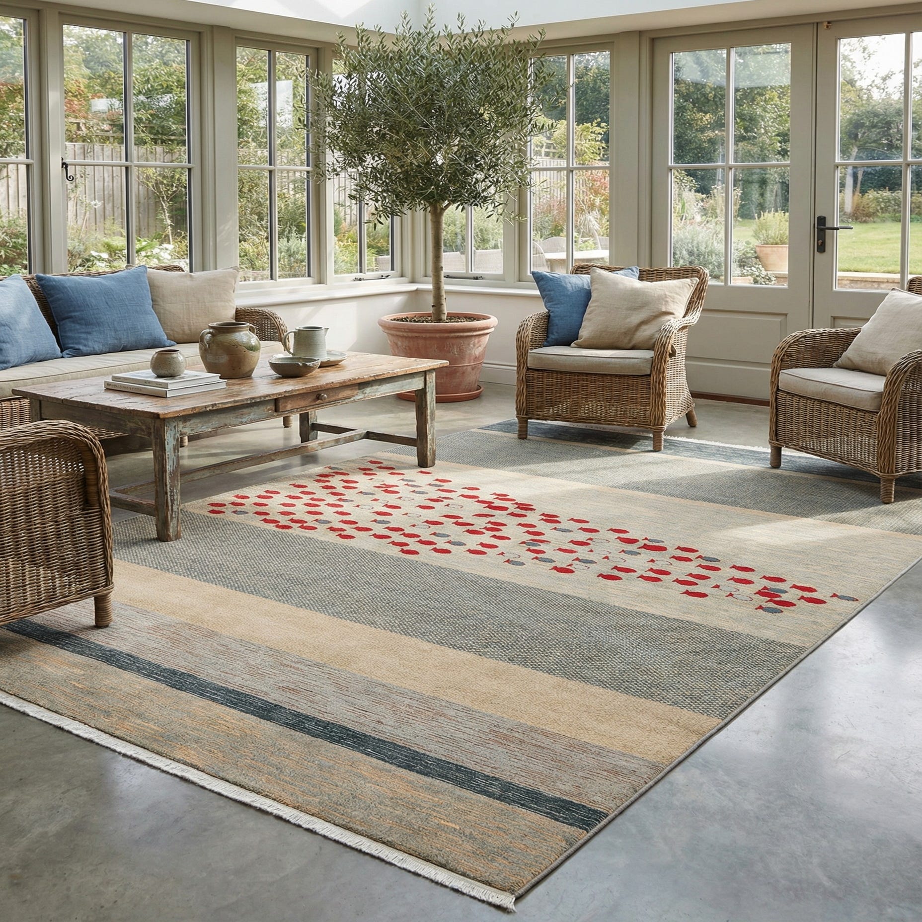 Works well in a coastal or nautical-inspired living room where the blue background and red accents complement weathered wood and white slipcovered seating. Bring it into a casual dining area or open-plan kitchen to add pattern and movement without heavy colorwork, or place it in a family room or children's play space for a friendly, modern touch. It also pairs nicely with natural fibers, light woods, and matte metal accents for contemporary or transitional interiors.