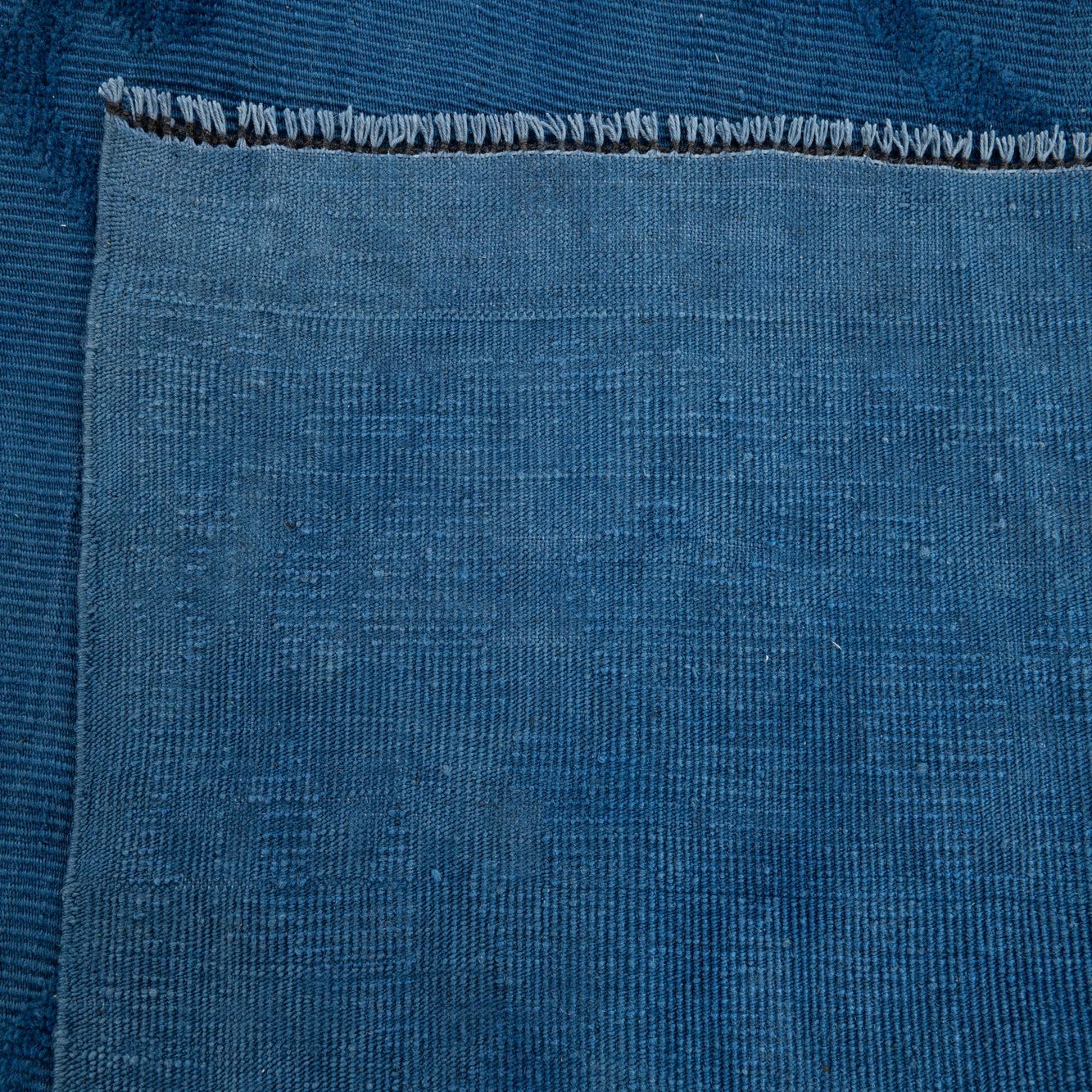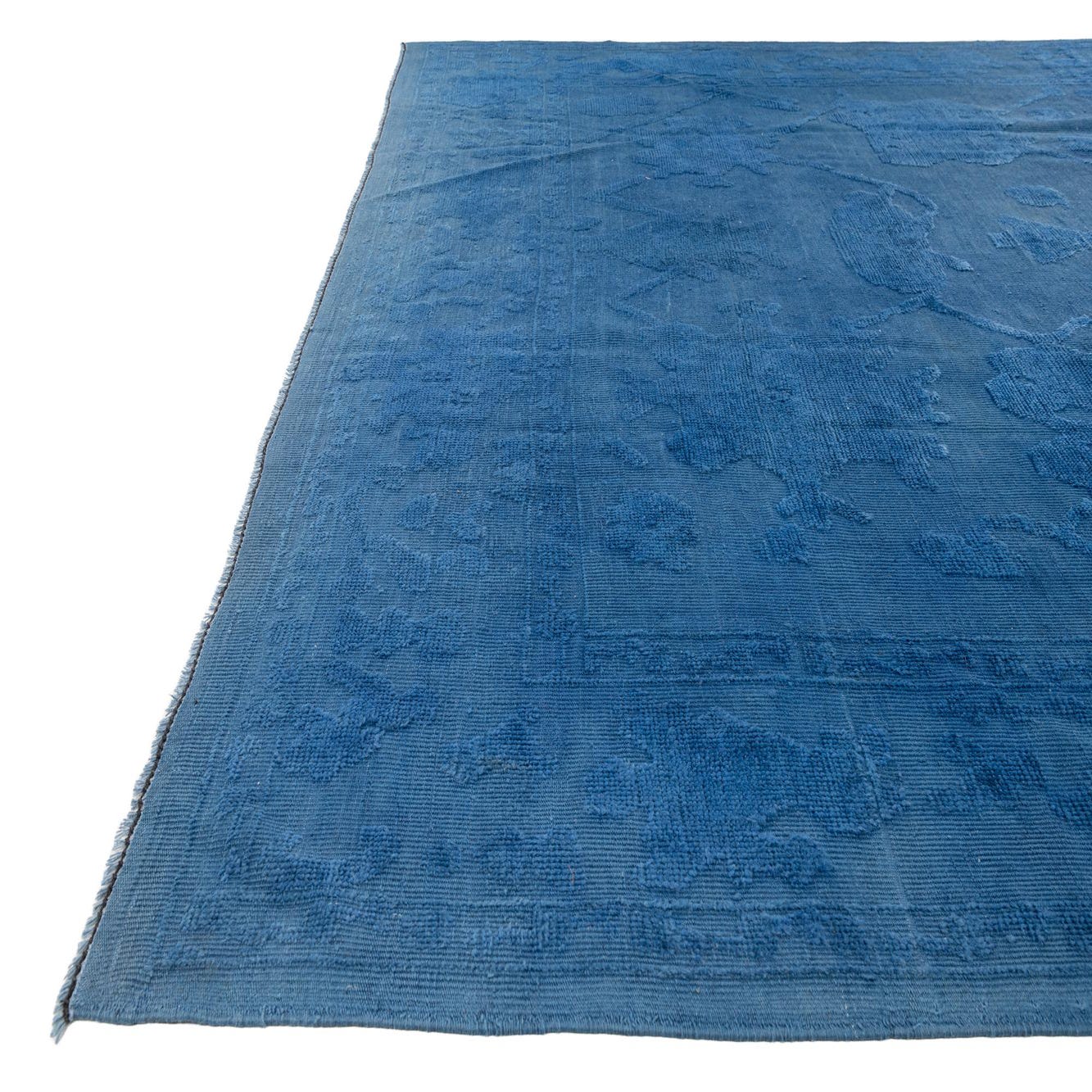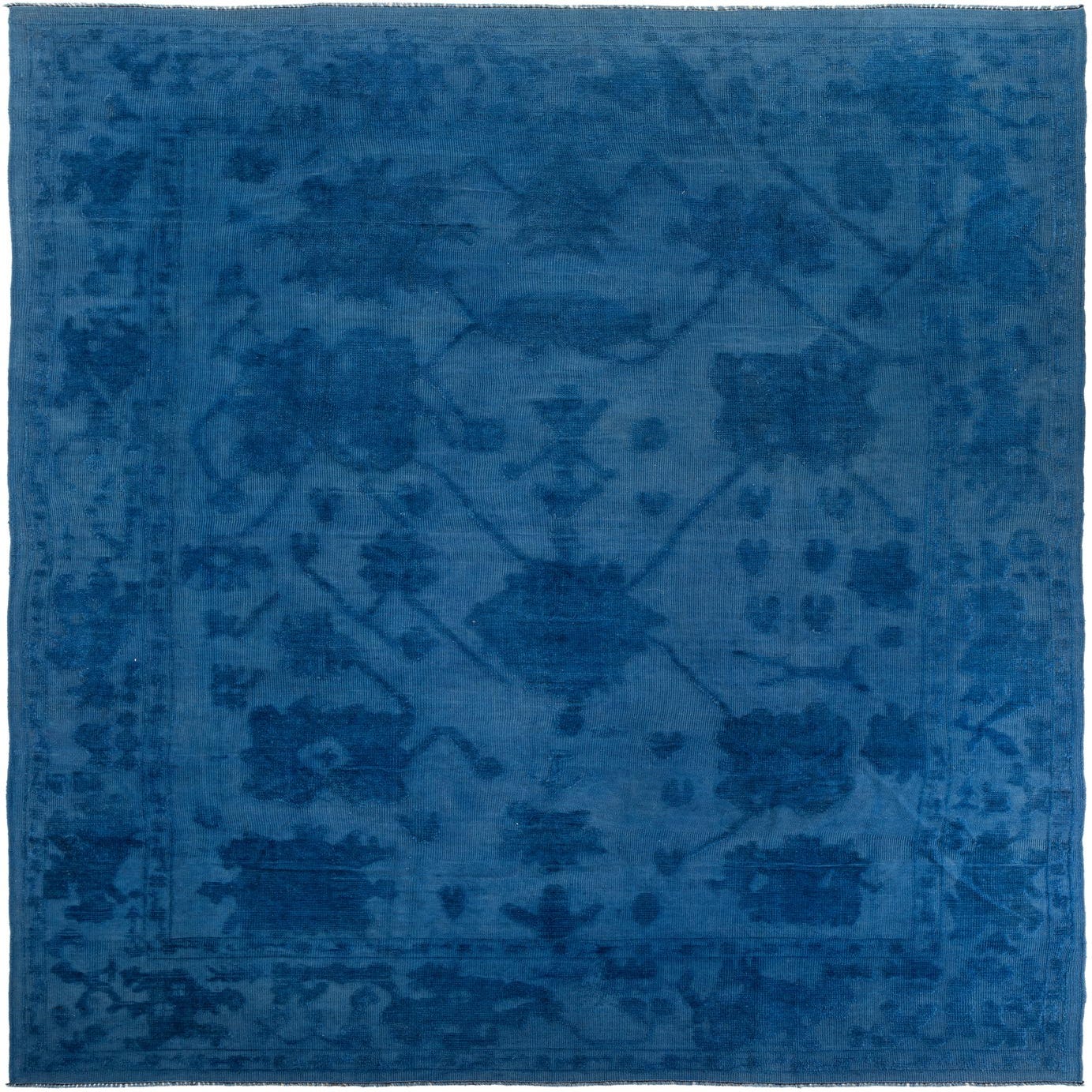 A large 10x14 rectangular Oushak rug in varying shades of deep blue with a subtle modern floral pattern.