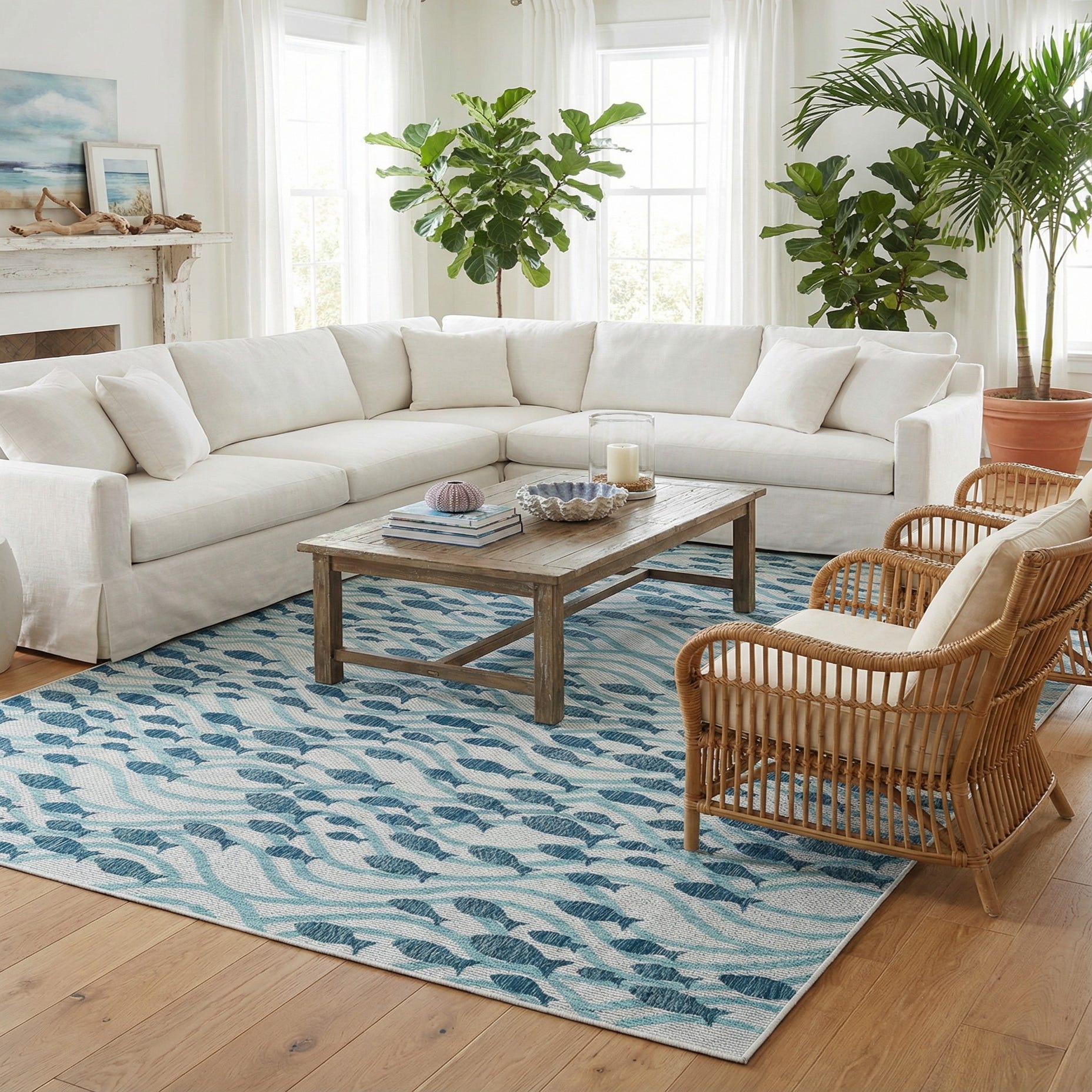 Machine-made of 100% polypropylene, the rug has a low, tightly woven surface that feels smooth with a faint, tactile rib where the pattern is woven in. It lays flat and comfortable underfoot, suitable for alfresco living as well as covered patios and sunrooms. Pair it with weathered teak or whitewashed wood furniture, crisp linen cushions and navy accents for a classic coastal room, or use it poolside, on a covered deck, or beneath an outdoor dining set to anchor casual, seaside-inspired spaces.