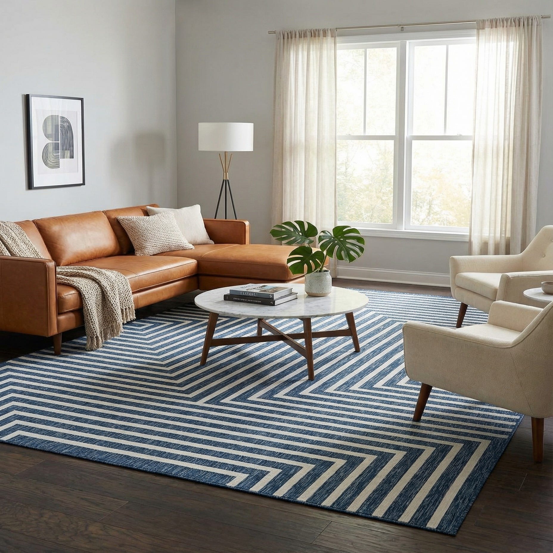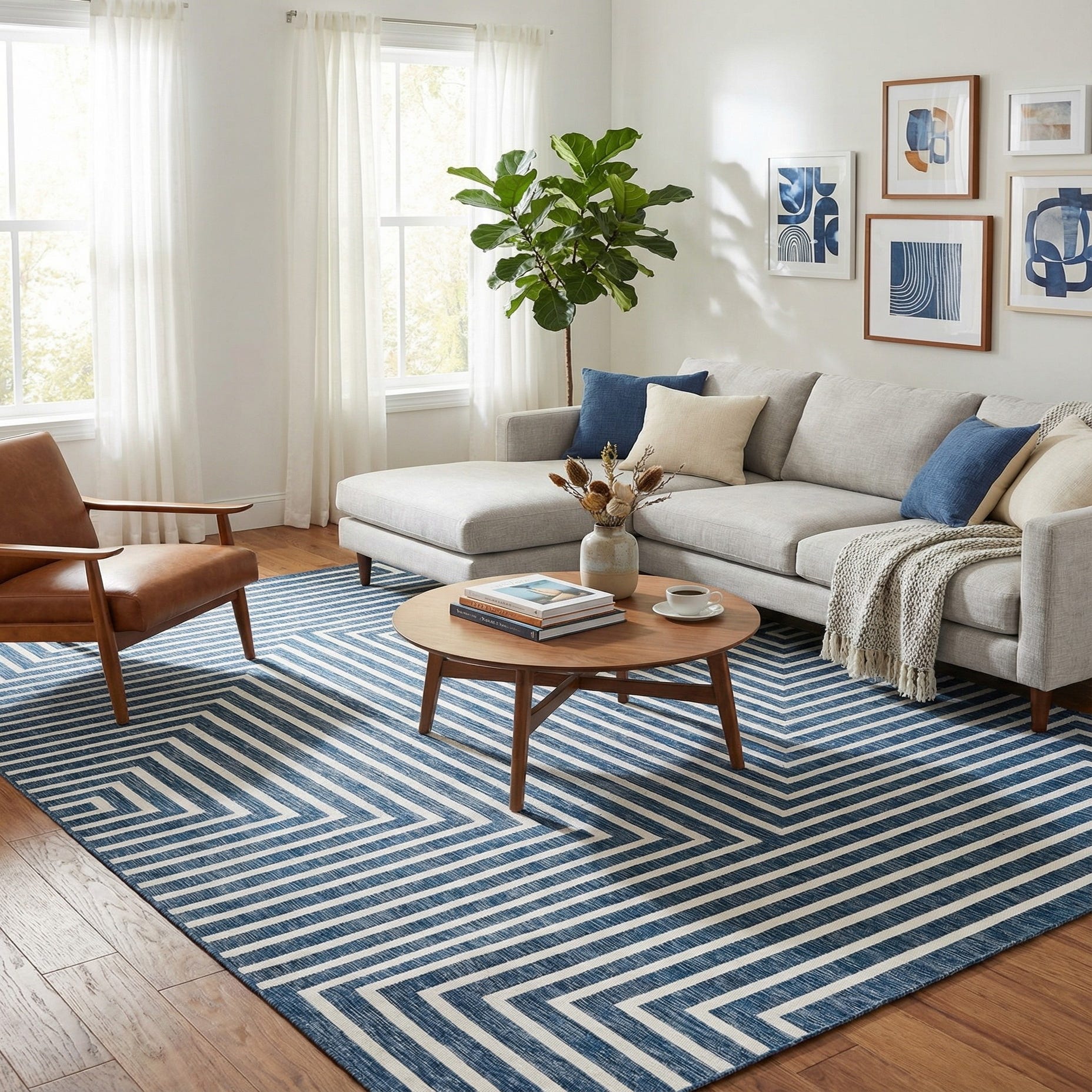 A 10x14 rectangular blue and white modern abstract rug with a geometric pattern of concentric squares and vertical stripes.