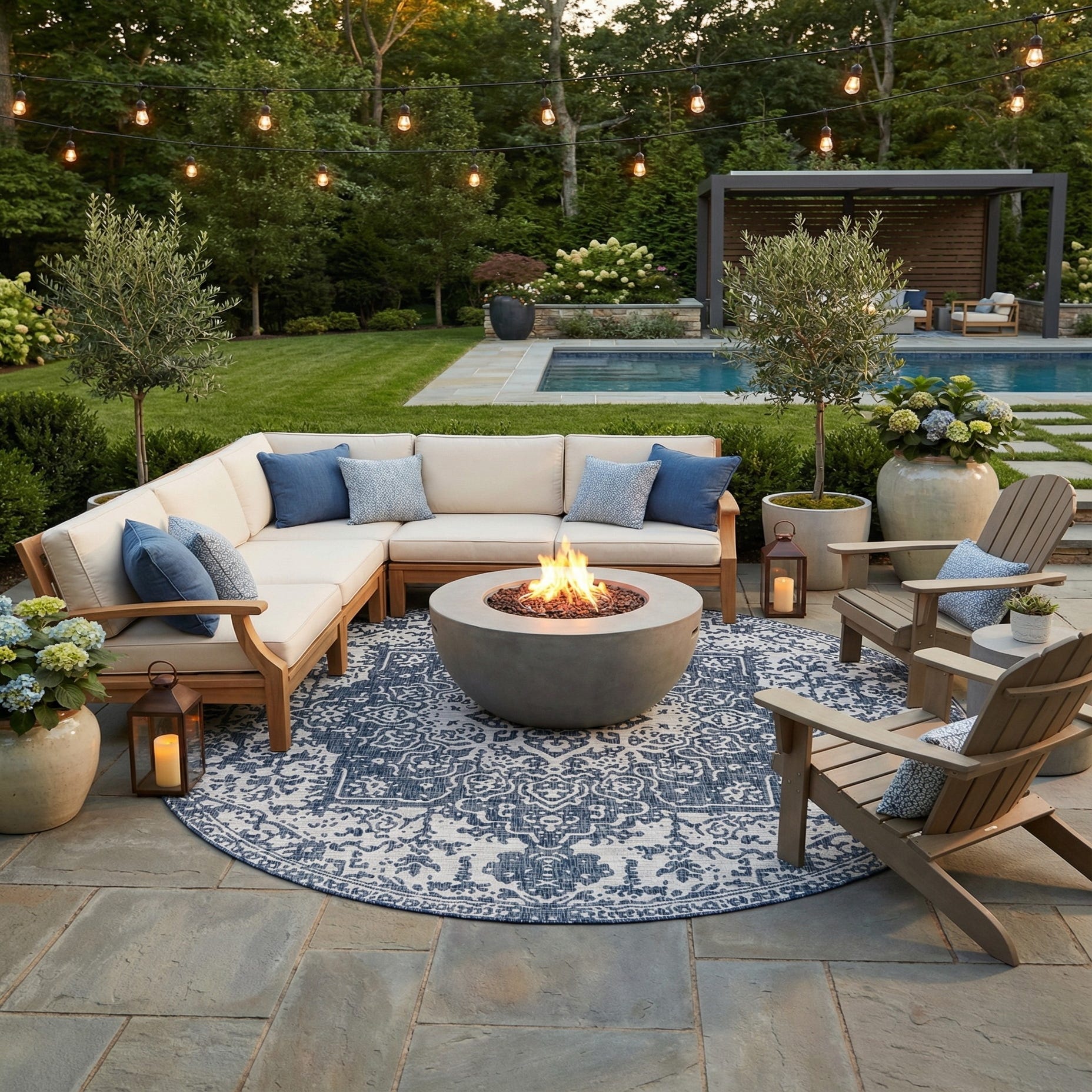This piece works well on a covered patio or sunroom as an anchor for outdoor seating, and it also layers easily in coastal, transitional, or modern farmhouse interiors. Use it beneath a round dining table to create a focused dining vignette, place it under a bistro set on a deck, or center it in a living area to tie together seating and accent furniture.
