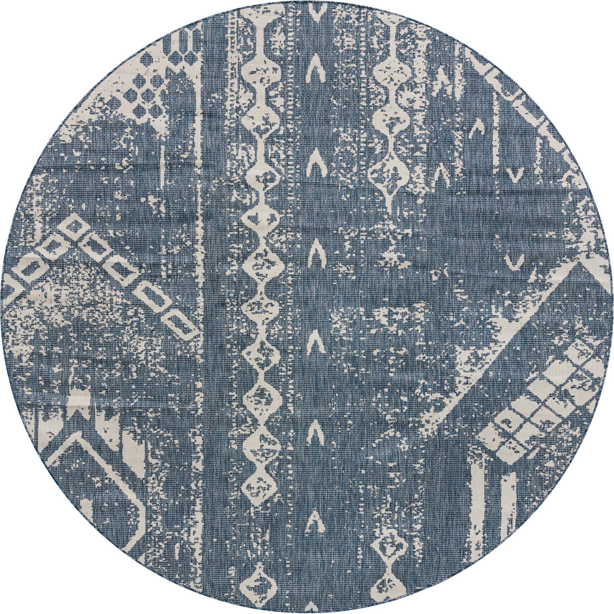 A round rug with a blue ground and ivory pattern, this piece shows a relaxed, bohemian-inspired design where vertical banding, diamond chains and distressed geometric motifs come together for a lived-in, layered look. The ivory accents sit against the textured blue background with a subtle, worn effect that adds visual depth without heavy pile. Machine-made from 100% polypropylene, the surface is low-profile and tightly woven, offering a firm but slightly textured feel underfoot.
