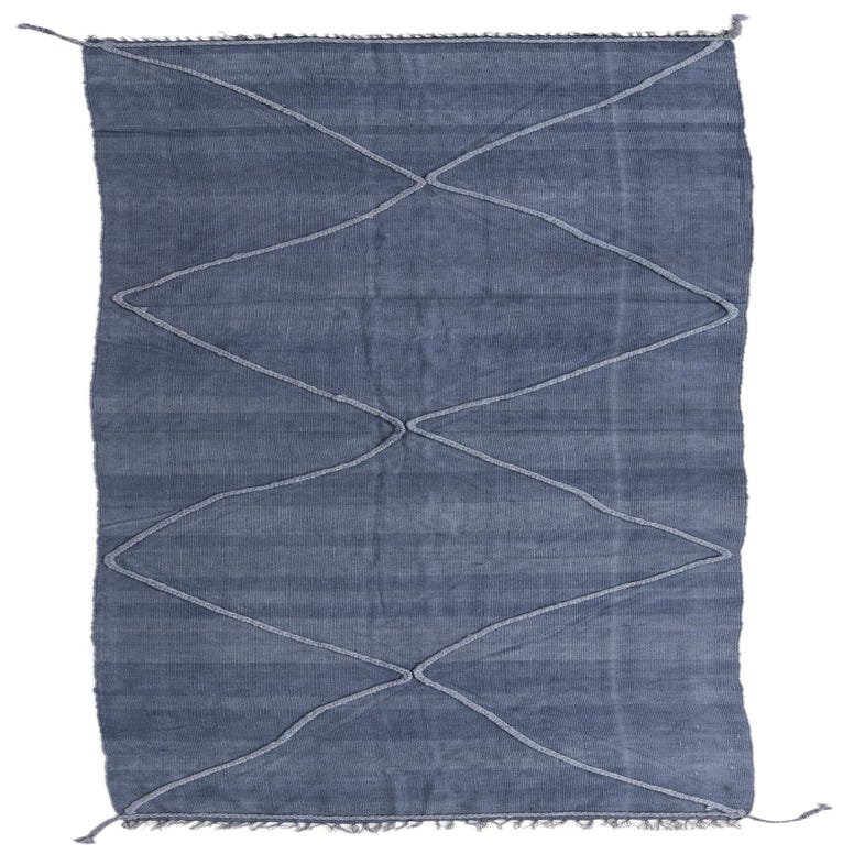 A long 11 ft blue wool runner rug with a light blue tribal diamond pattern and fringed ends, perfect for a hallway.