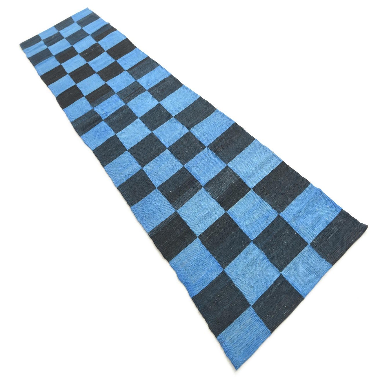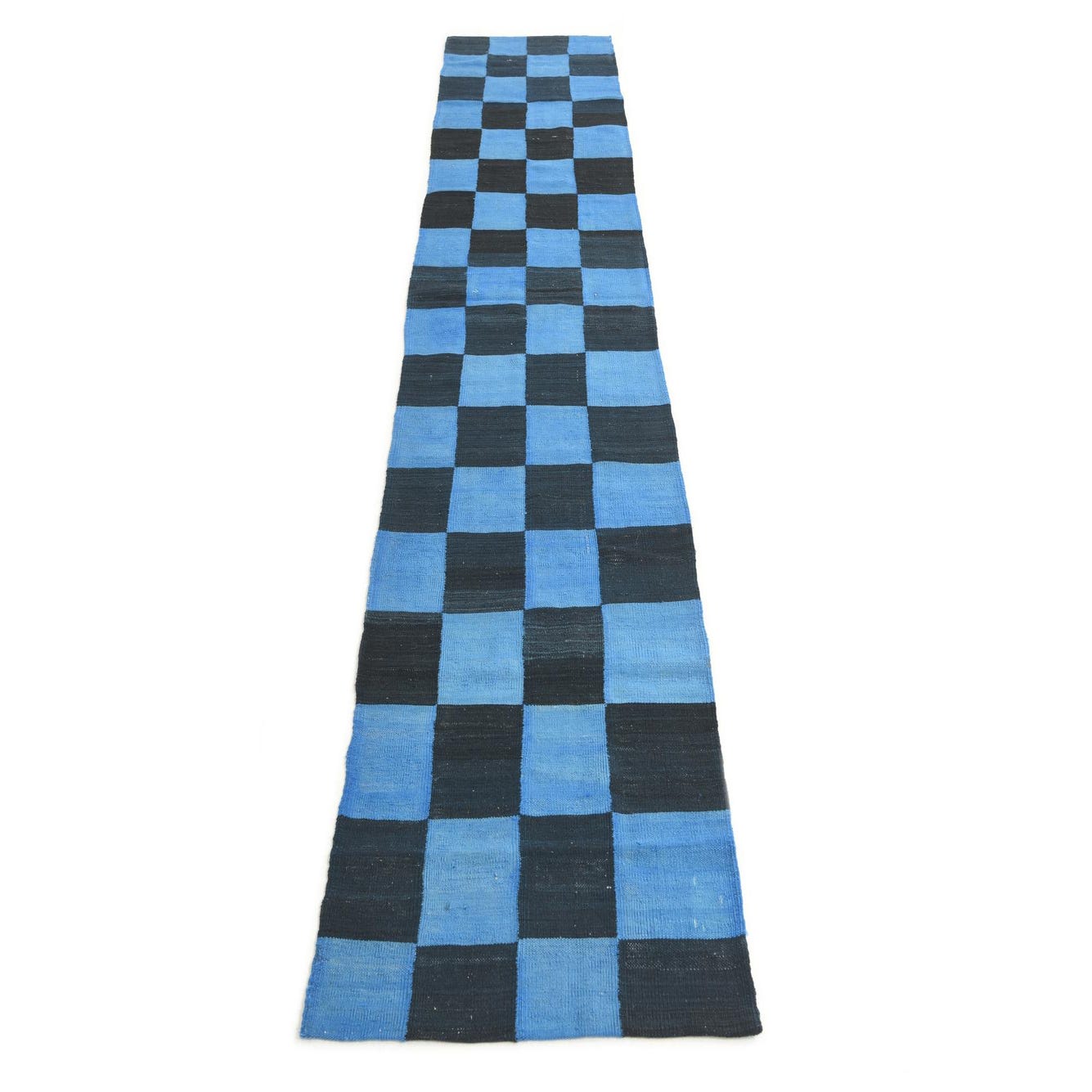 A long 11 ft runner rug featuring a bold checkerboard pattern of alternating black and bright blue squares, ideal for a hallway.