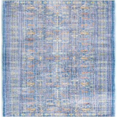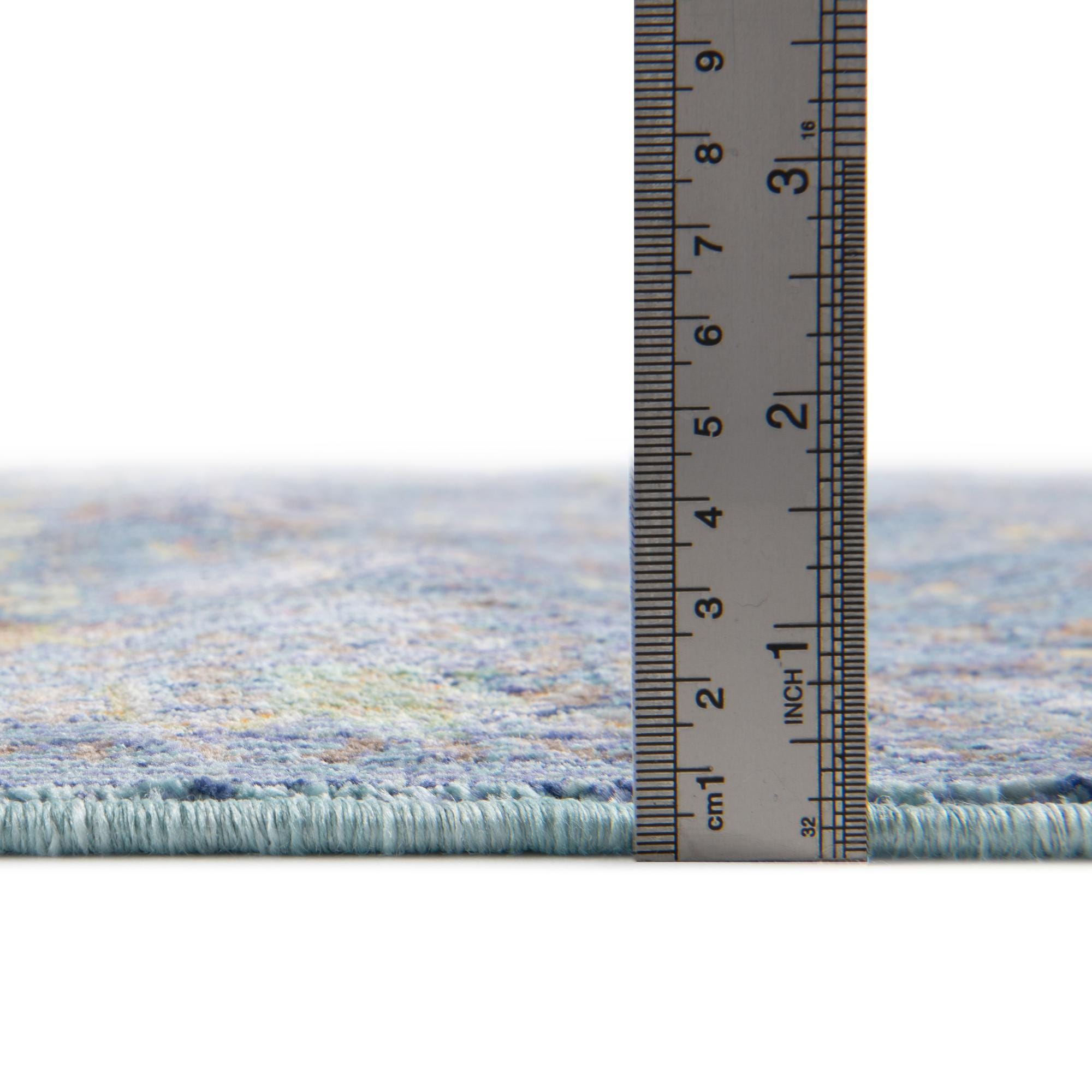 Primary color is Blue. Colors in this rug include: Blue, Gray, Ivory, Light Blue, Light Green, Pink, Yellow, Light Brown.