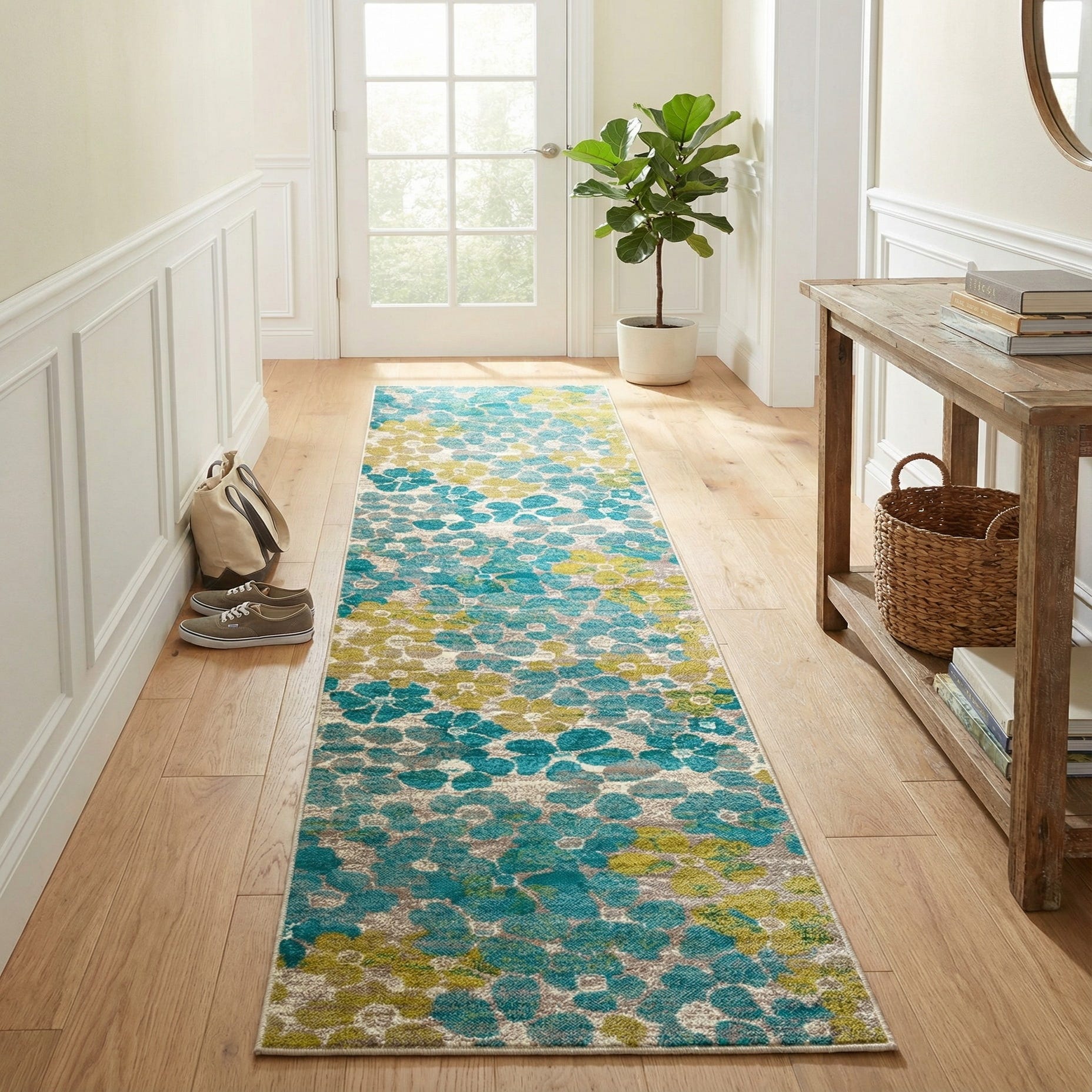 This runner brings color and pattern to hallways, entryways, and narrow kitchen aisles. It pairs nicely with light or white-painted wood, bleached oak, and mid-century modern furnishings, and it can also brighten a neutral living room or complement gray cabinetry in transitional or coastal-inspired interiors. Use it to introduce pattern without overwhelming a space or to tie together teal, green, and ivory accents.