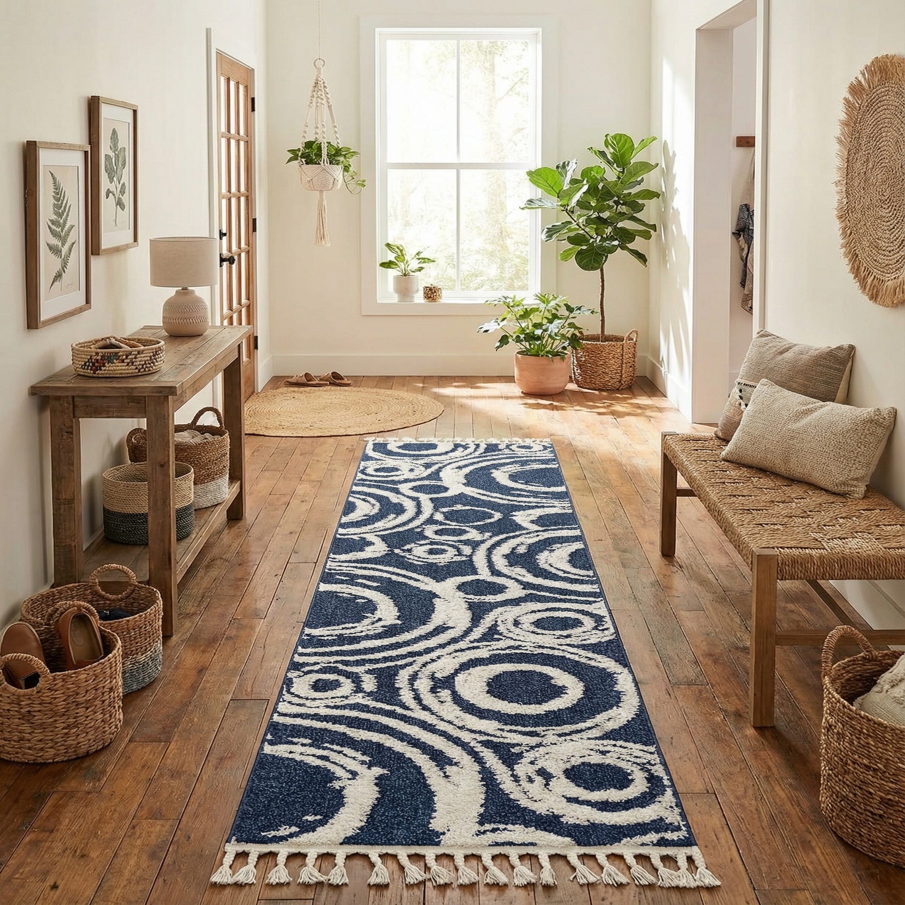 A 12 ft blue runner rug with a modern abstract white concentric circle pattern and fringed ends, suitable for a hallway.