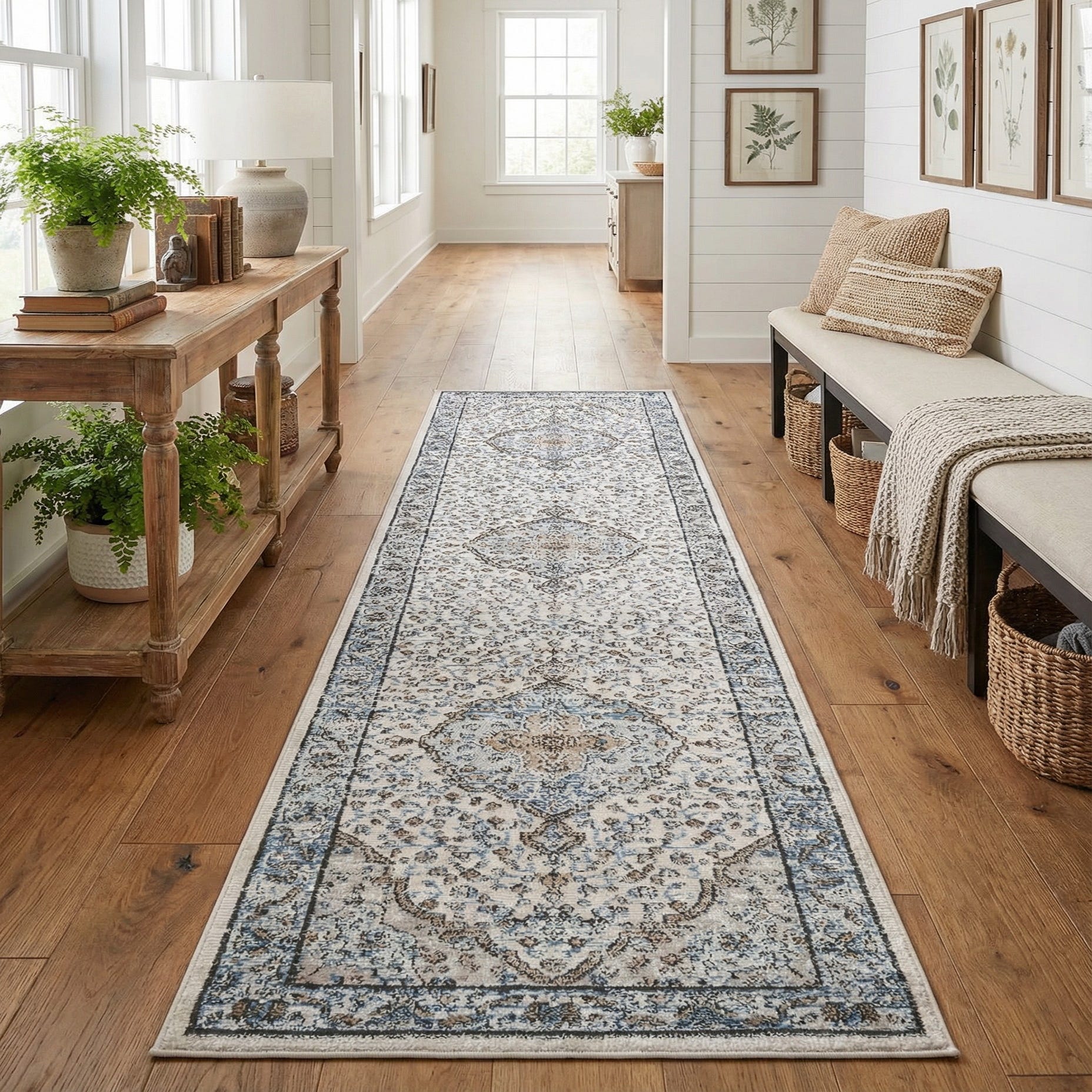 A classic medallion runner with a gently worn, vintage-inspired pattern, this rug pairs a structured border with three repeating central medallions and a delicate allover floral scatter. The blue background anchors the design while light blue and ivory highlights bring the motifs forward; beige and brown accents add warmth and gray outlining defines the pattern. Machine made from 100% polypropylene, the low-profile pile has a smooth, slightly dense texture that feels soft underfoot while maintaining a defined surface—easy to place beneath furniture or along a traffic path.