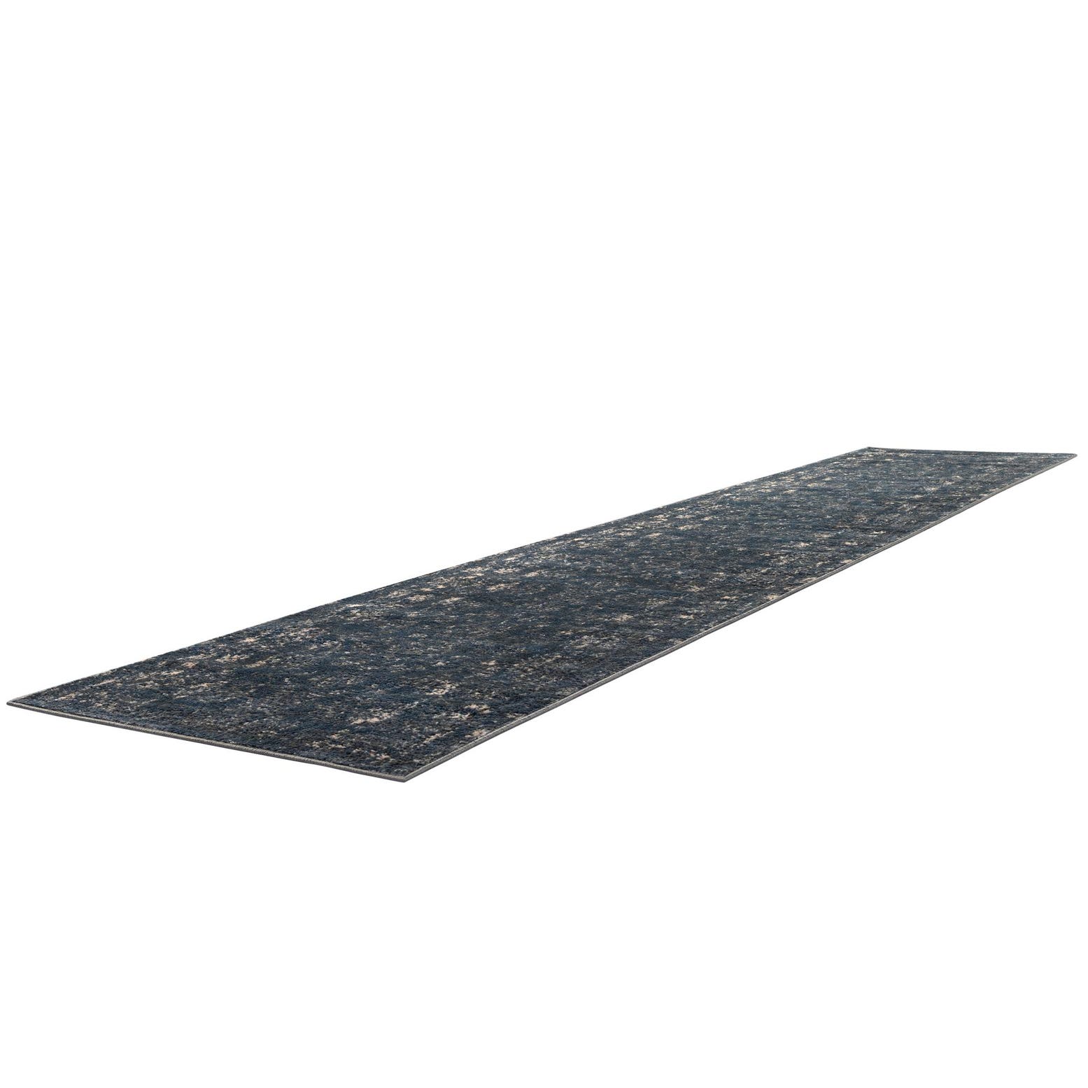 A softly distressed, abstract surface gives this hand-knotted runner a lived-in, layered look. Mottled strokes of ivory and gray rest on a blue background, forming an irregular, painterly pattern that adds visual texture without a strict repeat. The blend of 85% polypropylene and 15% polyester produces a dense, low-to-medium pile with a slight sheen and a comfortable, tactile feel underfoot.