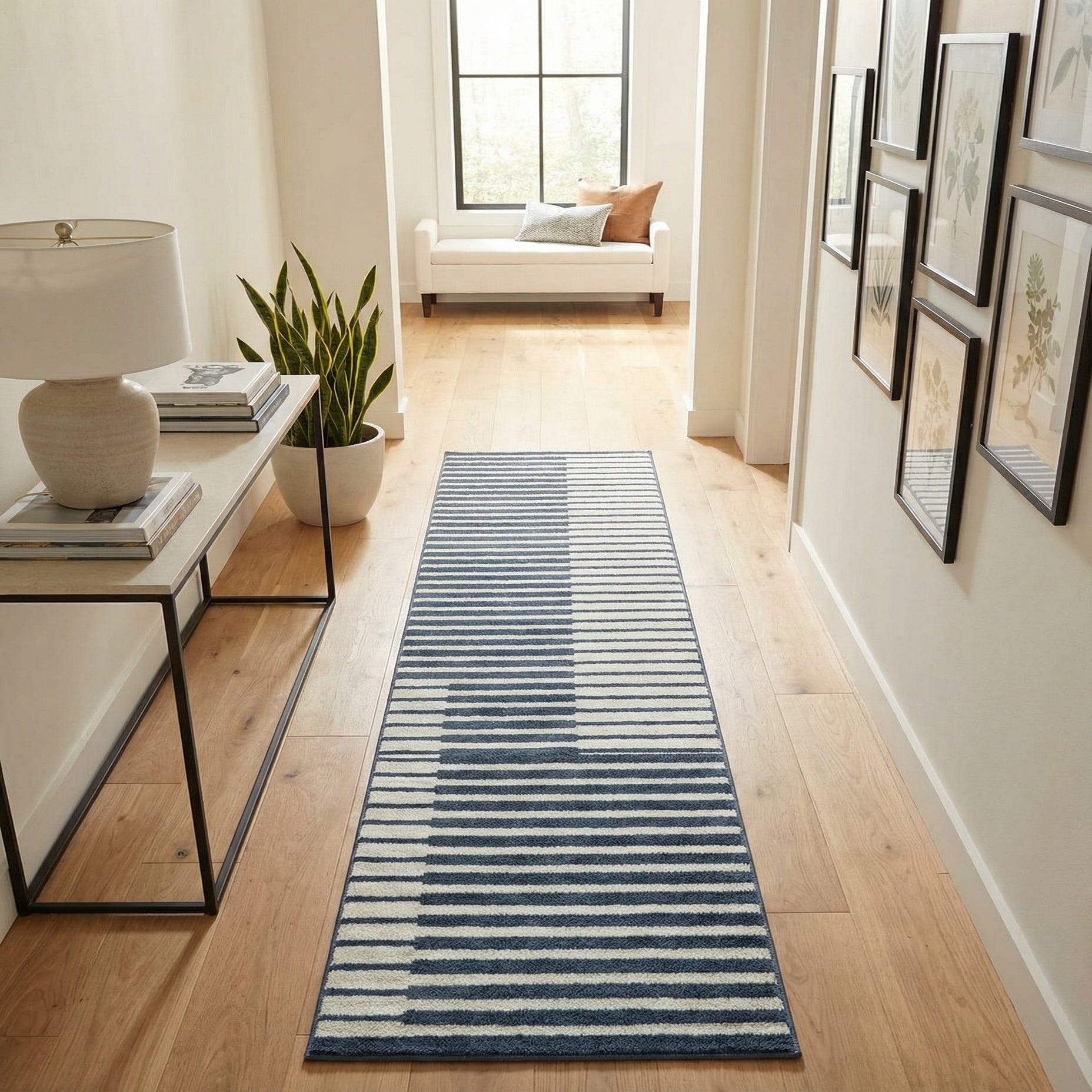 Machine made of 100% polypropylene, this runner offers a consistent texture and color ideal for hallways, entryways, or along a kitchen island. The blue-and-ivory palette pairs well with coastal or Scandinavian schemes and complements light wood floors and white trim; it also works in contemporary or transitional spaces when combined with matte black metal accents and natural-fiber accessories.
