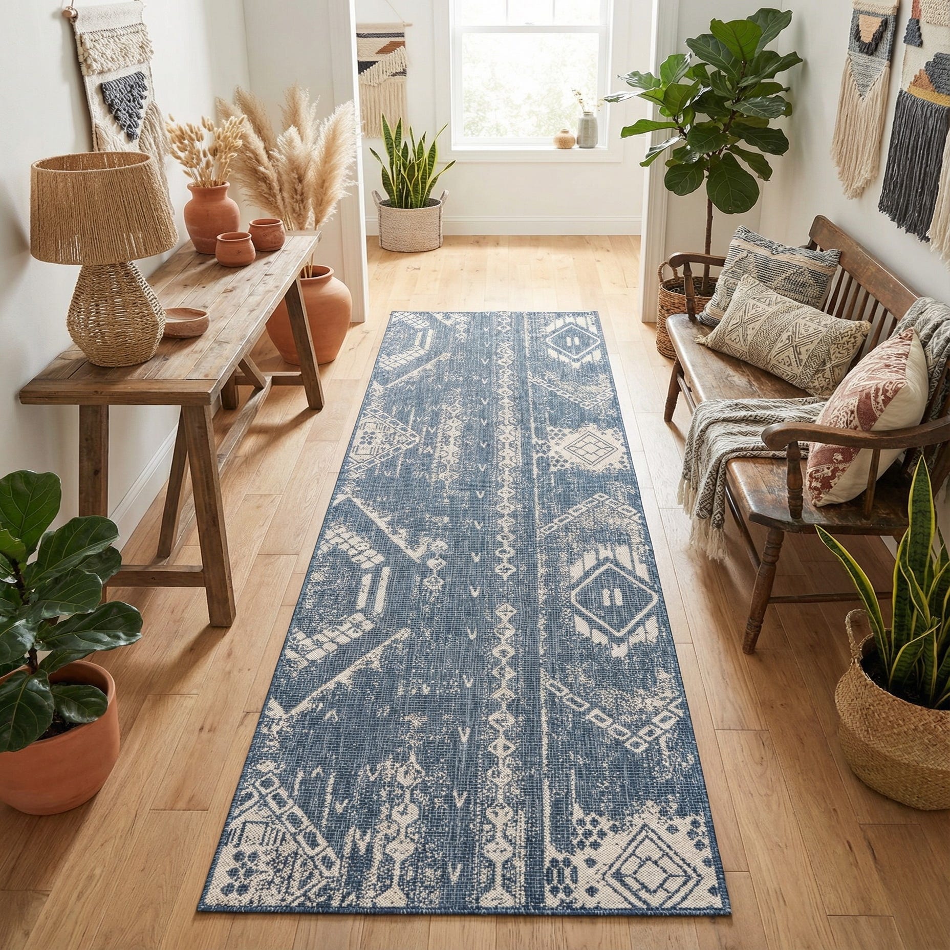 The blue and ivory colors create a versatile palette that can complement both vibrant and subdued color schemes. Its stain-resistant and shed-free properties make it a practical option for spaces frequented by pets and children. The runner's texture and resilient material are well-suited for patio, deck, and poolside areas, providing both comfort and style. It could also serve as a connecting piece in longer hallways or as a decor highlight in a sunroom, blending seamlessly with both modern and traditional interiors.