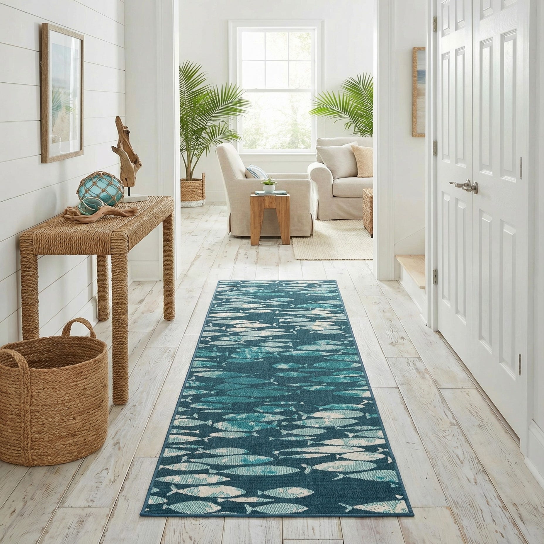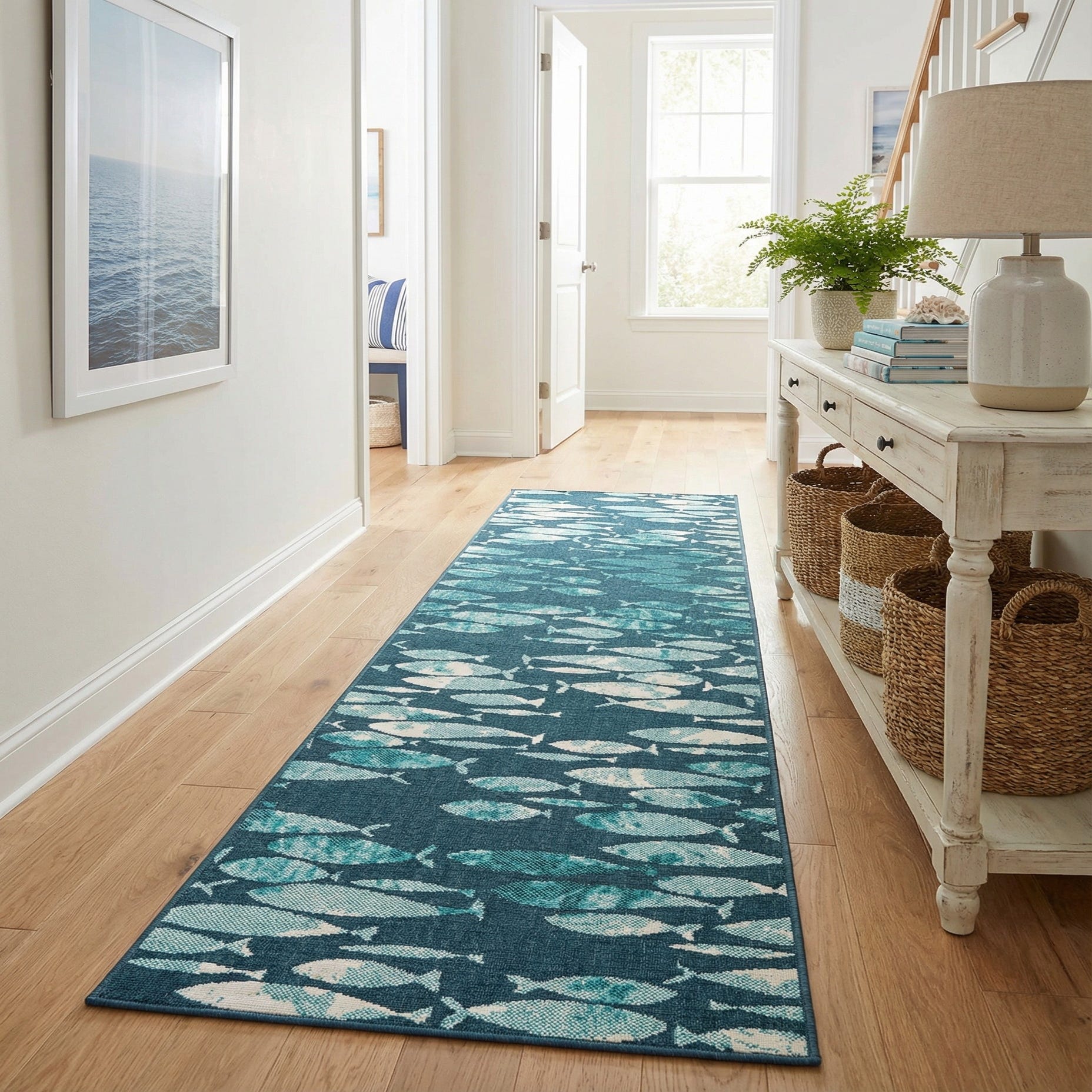 A 12 ft runner rug featuring a modern school of fish pattern in various shades of blue and white on a dark blue background, suitable for a hallway or patio.