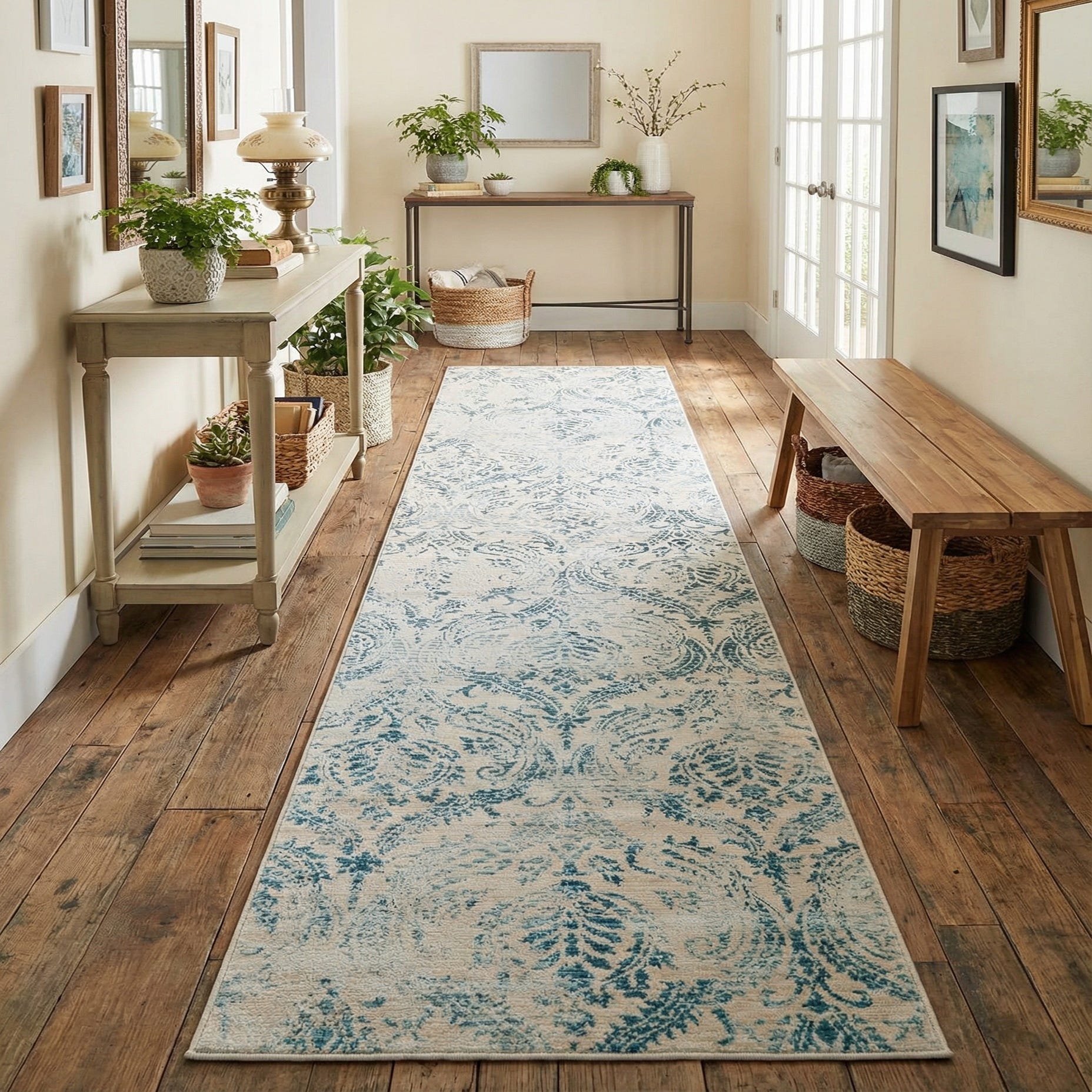 Sized for narrow spaces, this runner anchors hallways, entryways, galley kitchens and the length of a bedroom beside a bed. It pairs well with painted or weathered wood furniture, neutral upholstery and navy or cream accents, and complements coastal, transitional or softly traditional interiors looking for a muted pattern that adds interest without dominating the room.