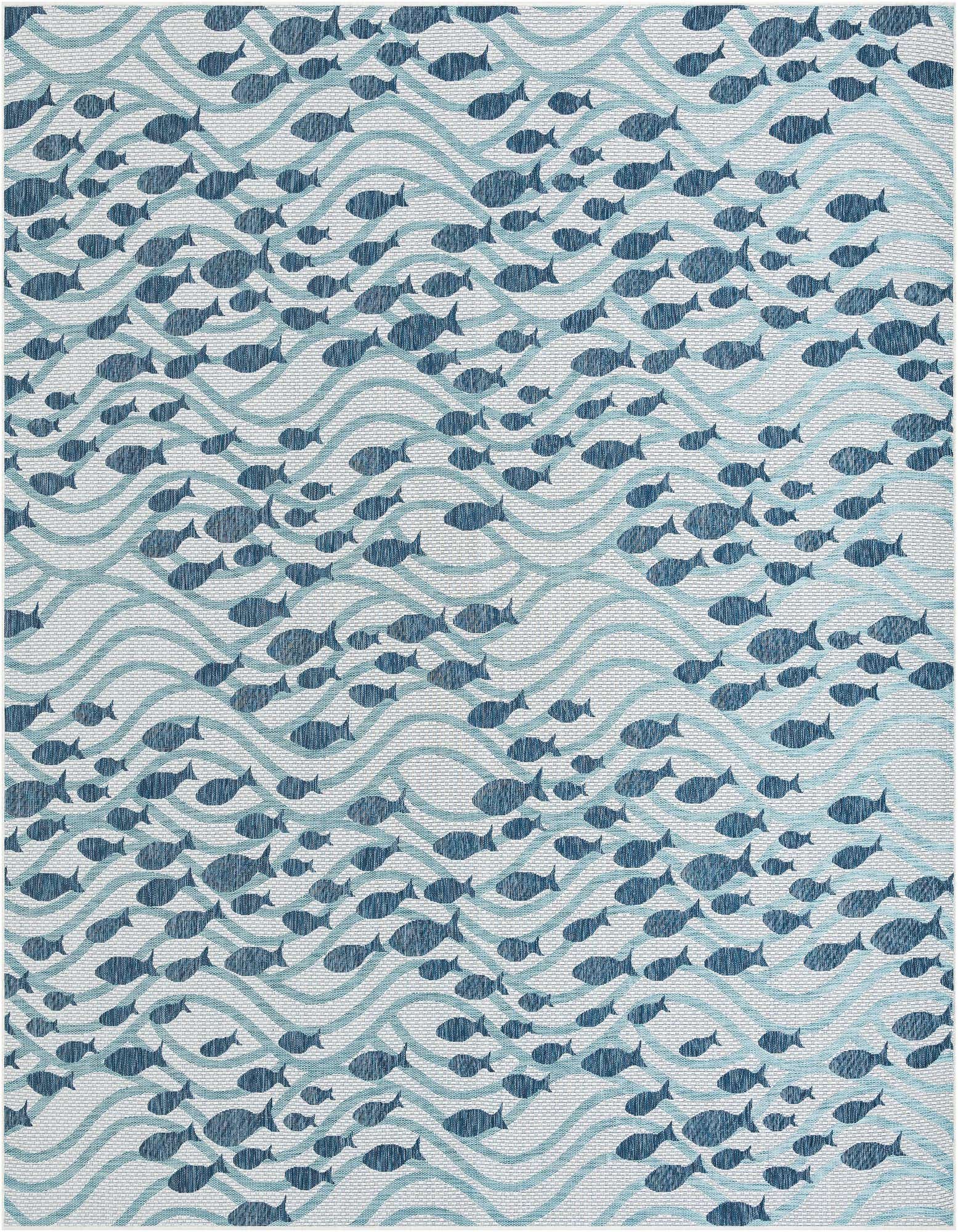 This Outdoor Coastal Collection rug brings a touch of marine charm with its playful pattern reminiscent of fish swimming in the sea. The dominant blue background is complemented by varying shades of navy blue, light blue, and ivory, coming together to create a dynamic and soothing aquatic design.