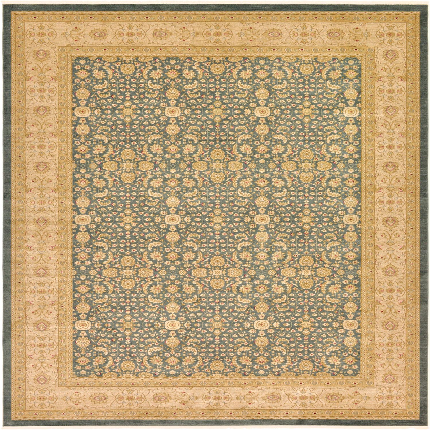 Primary color is Blue. Colors in this rug include: Blue, Cream, Red, Tan, Olive.