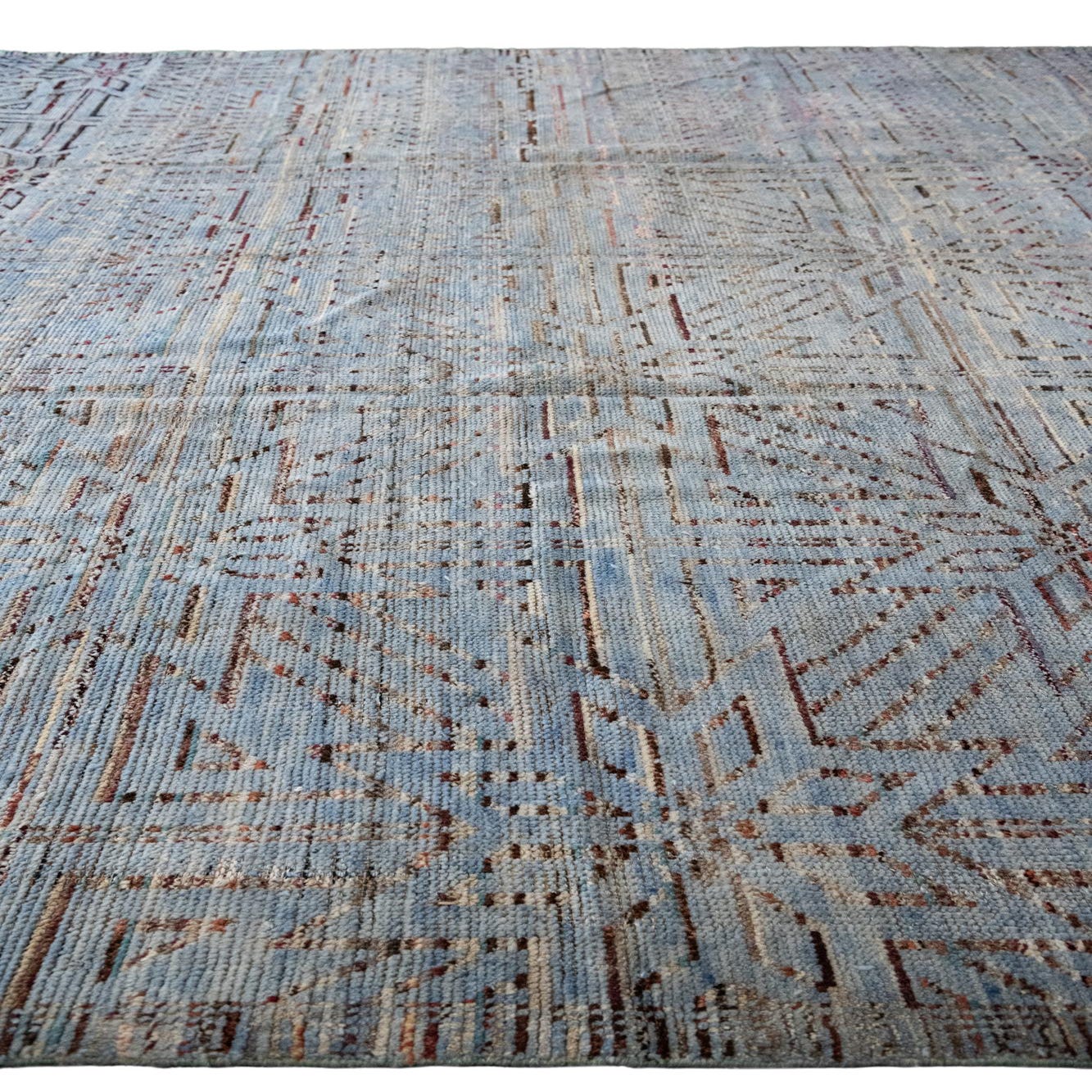 A large 12x16 rectangular blue wool shag rug featuring a distressed modern tribal pattern with subtle vintage oriental motifs.