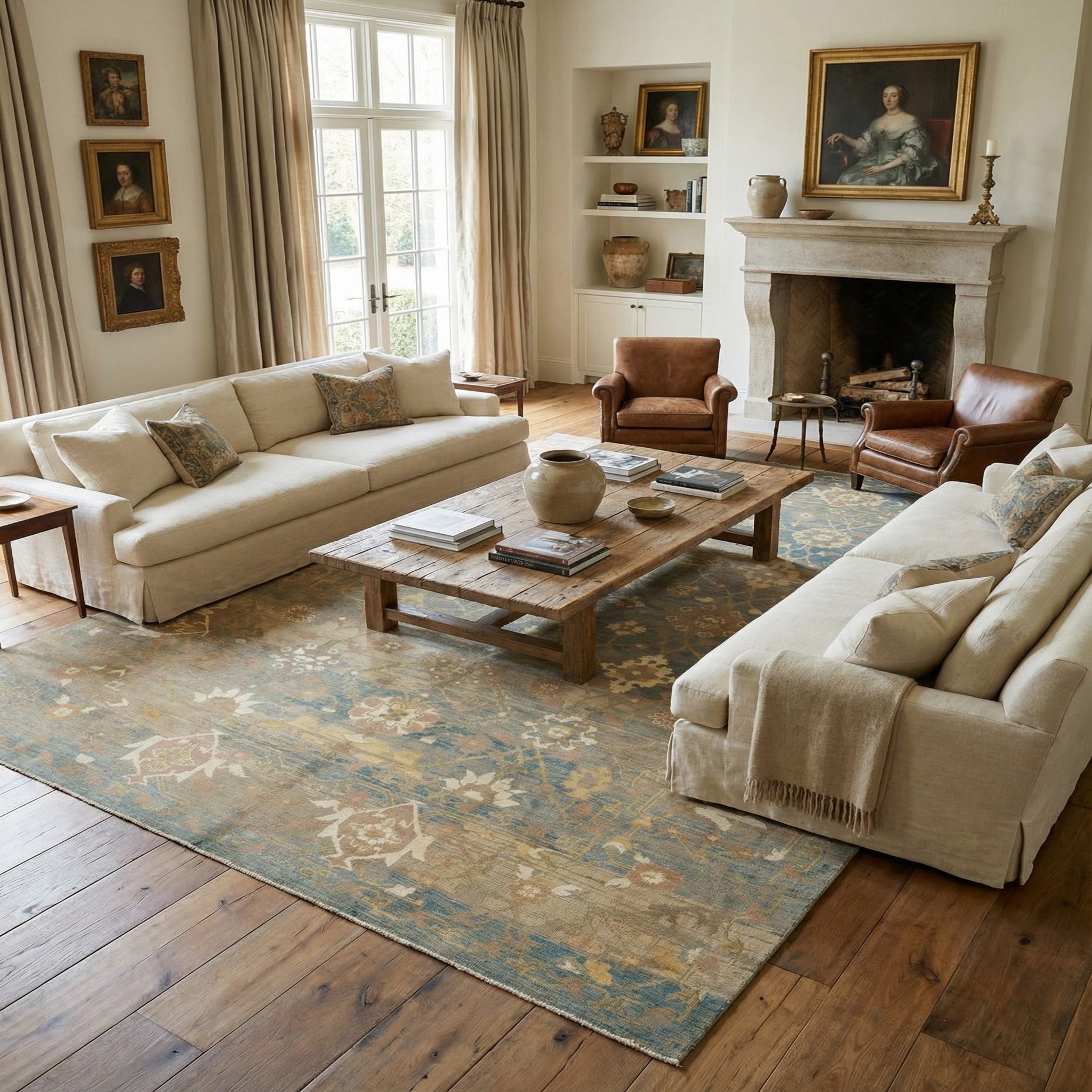 A large 12x16 rectangular Oushak wool rug featuring a distressed blue and beige traditional floral and tribal pattern.