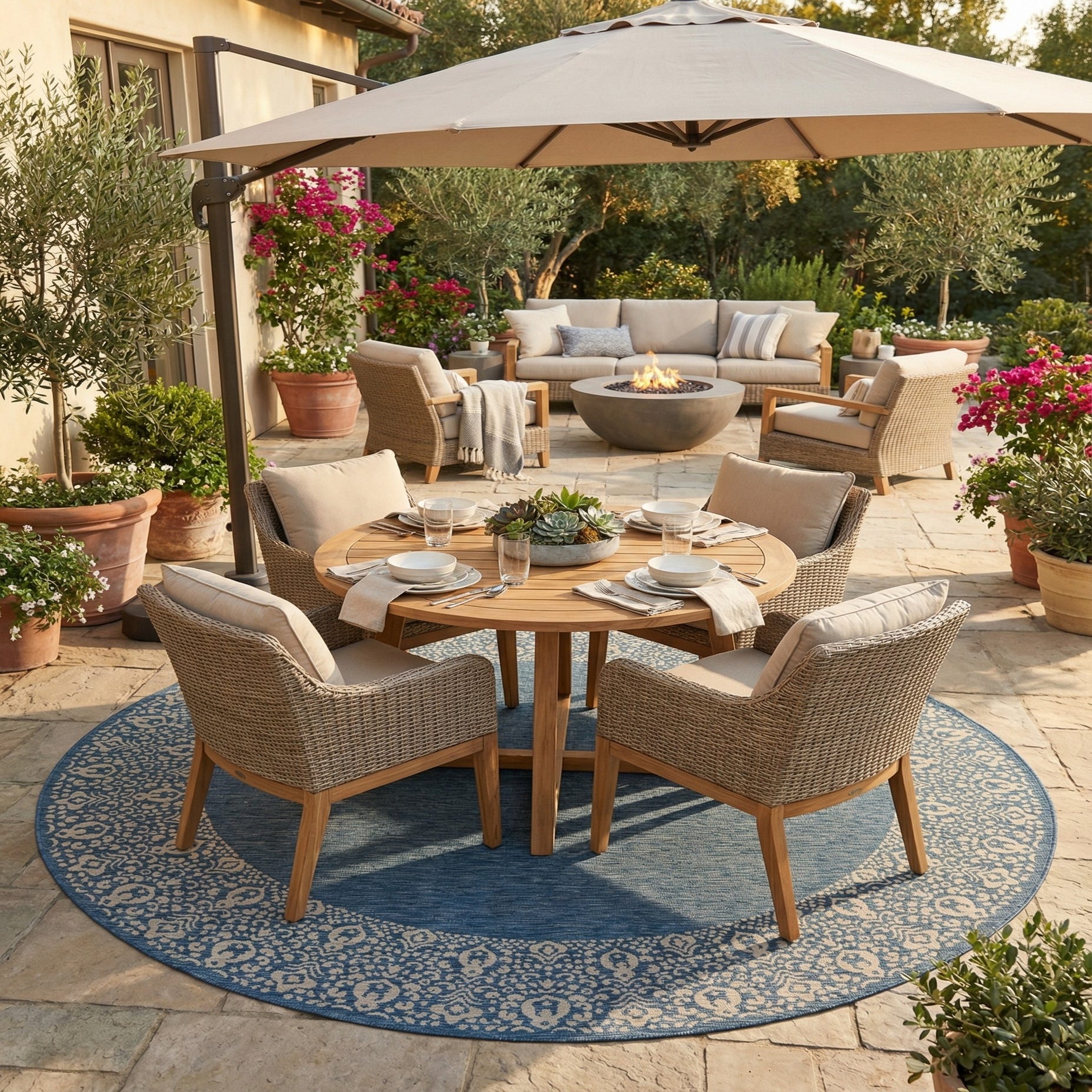 A 13' round blue outdoor rug with a light beige vintage-inspired border pattern, ideal for a patio.