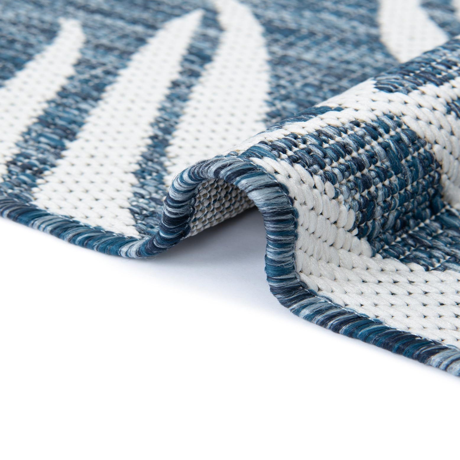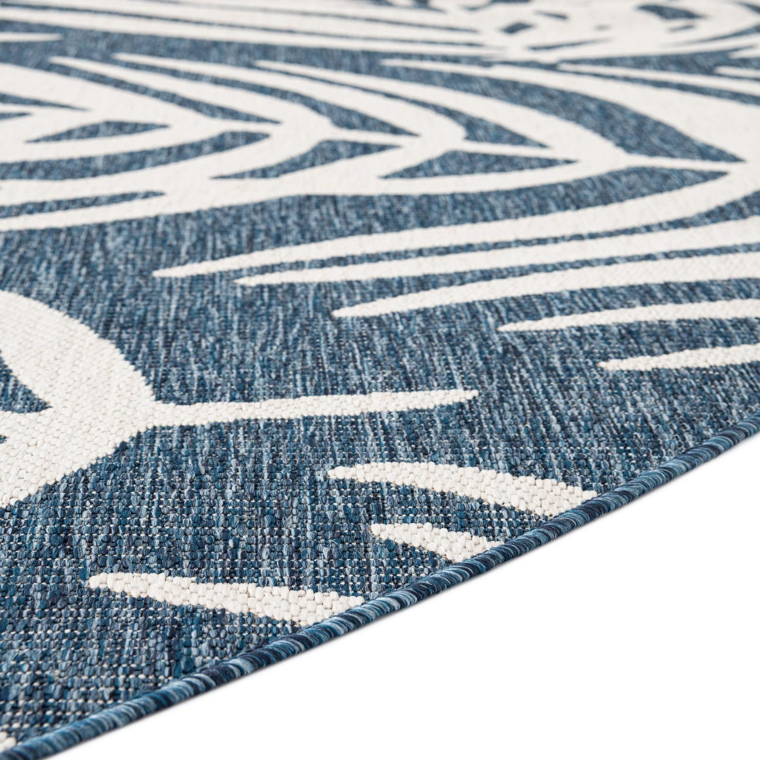 A cascade of ivory palm fronds lays across a heathered blue ground, creating a botanical motif with a relaxed, coastal feel. The machine-made construction in 100% polypropylene produces a low-profile, tightly woven surface that feels slightly textured underfoot—firm enough to support outdoor furniture yet soft enough for bare feet. The printed leaf pattern has crisp edges against the blue background, offering a clean, contemporary take on tropical design.