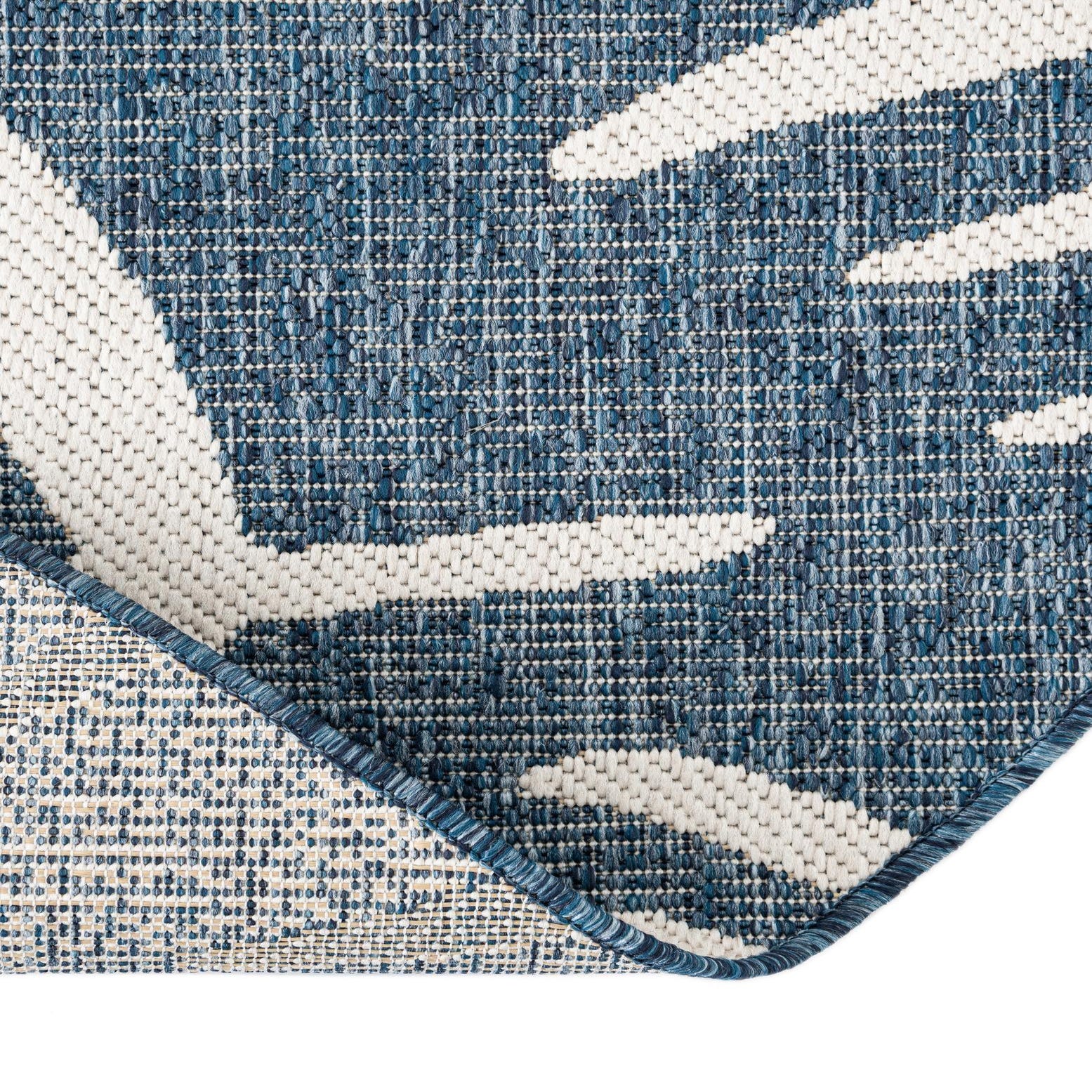 A large 13' round blue outdoor rug with a white tropical palm leaf pattern, ideal for a patio.