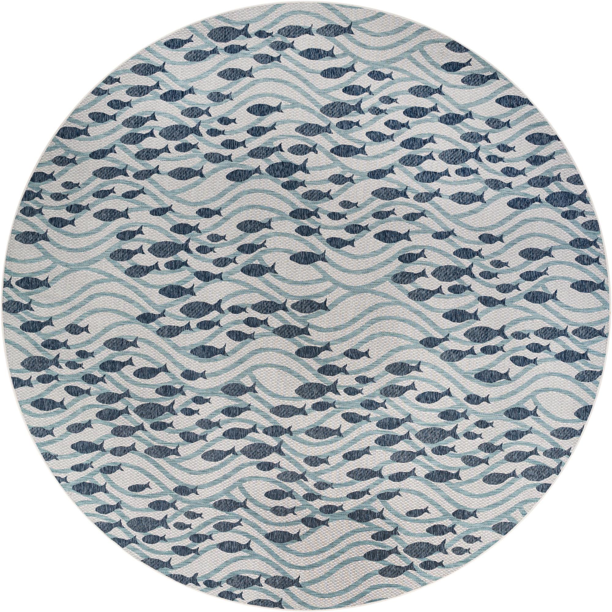 A round 13' blue and white indoor/outdoor rug featuring a playful school of dark blue fish swimming amidst light blue wavy lines.
