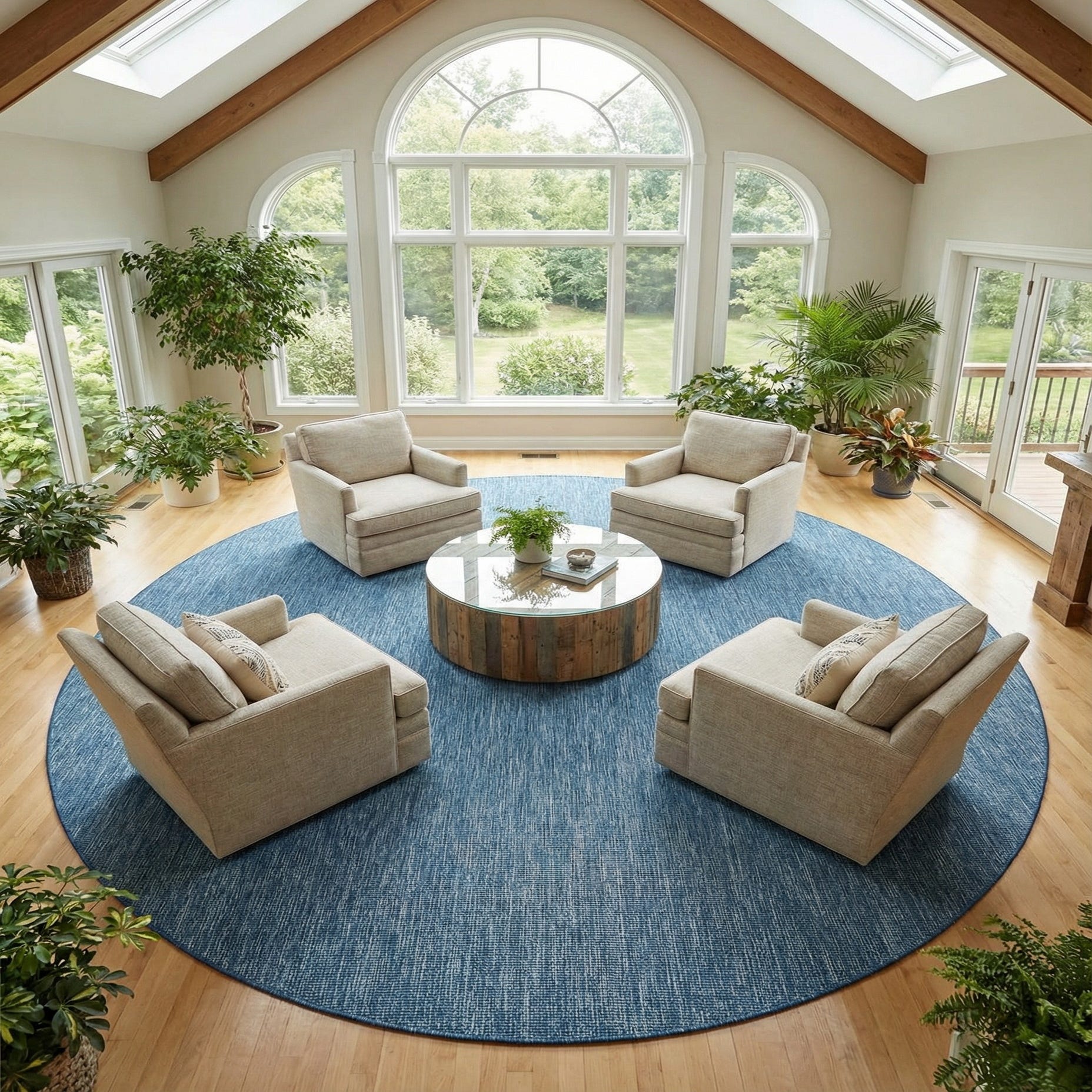 Place it on a covered patio or sunroom to anchor an outdoor seating group, or use it indoors beneath a round dining table or in a living area to bring a relaxed, coastal-inspired tone to the room. Pair with whitewashed woods, navy accents, and natural fiber accessories for a cohesive, easygoing scheme.
