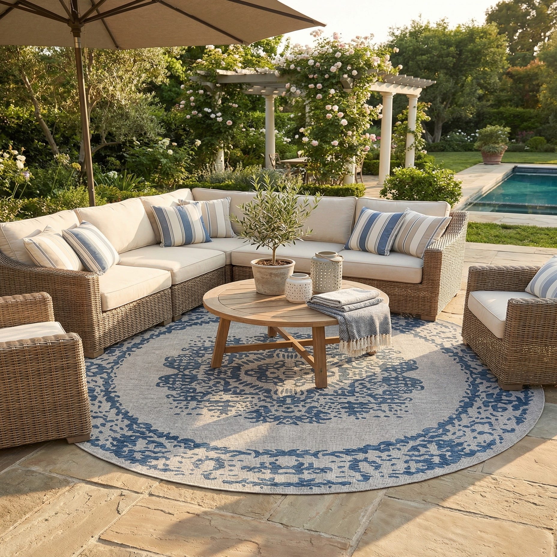 Use this rug to anchor a covered patio dining set, pair it with weathered wood furniture and navy cushions for a coastal-meets-traditional feel, or set it beneath a round dining table to reinforce a soft, symmetrical layout. It also works in a living room with light linens and iron accents or on a sunroom floor alongside woven seating for relaxed, layered styling.