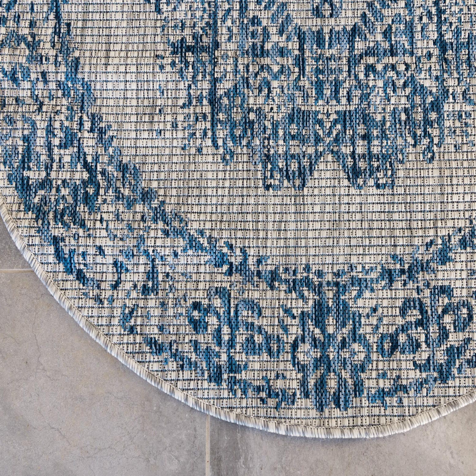 A classic medallion pattern is updated with a gently distressed look across a round silhouette. The blue background provides a calm base for the gray ornamental motif and border, where aged detailing and subtle shading create visual depth. Machine made from 100% polypropylene, the low-profile weave has a firm, slightly textured surface that holds pattern definition while remaining comfortable underfoot.