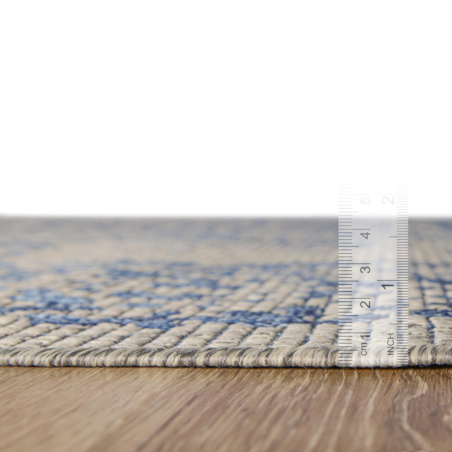 Use this rug to anchor a covered patio dining set, pair it with weathered wood furniture and navy cushions for a coastal-meets-traditional feel, or set it beneath a round dining table to reinforce a soft, symmetrical layout. It also works in a living room with light linens and iron accents or on a sunroom floor alongside woven seating for relaxed, layered styling.