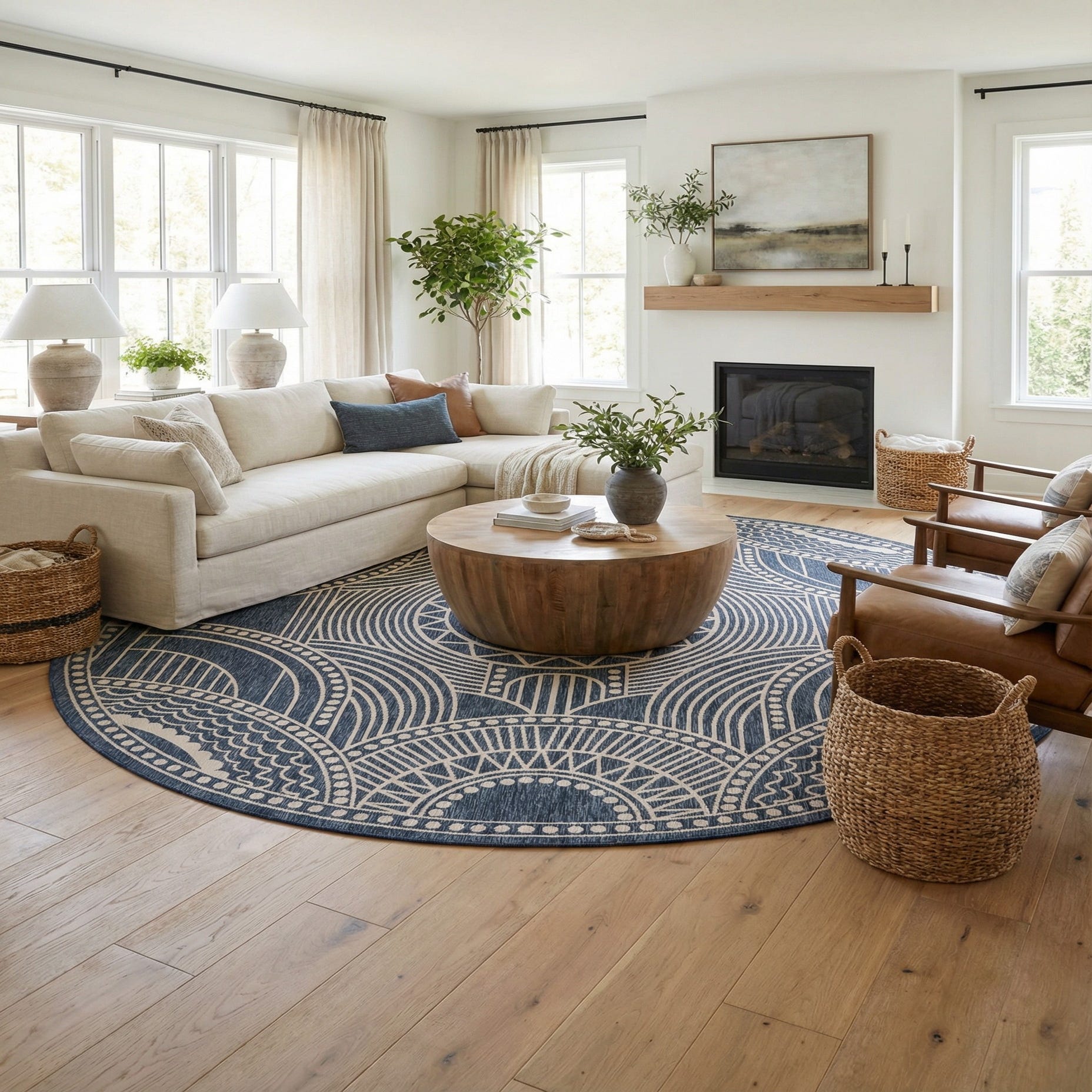 A large round blue and white rug with a geometric medallion pattern, suitable for indoor or outdoor use.