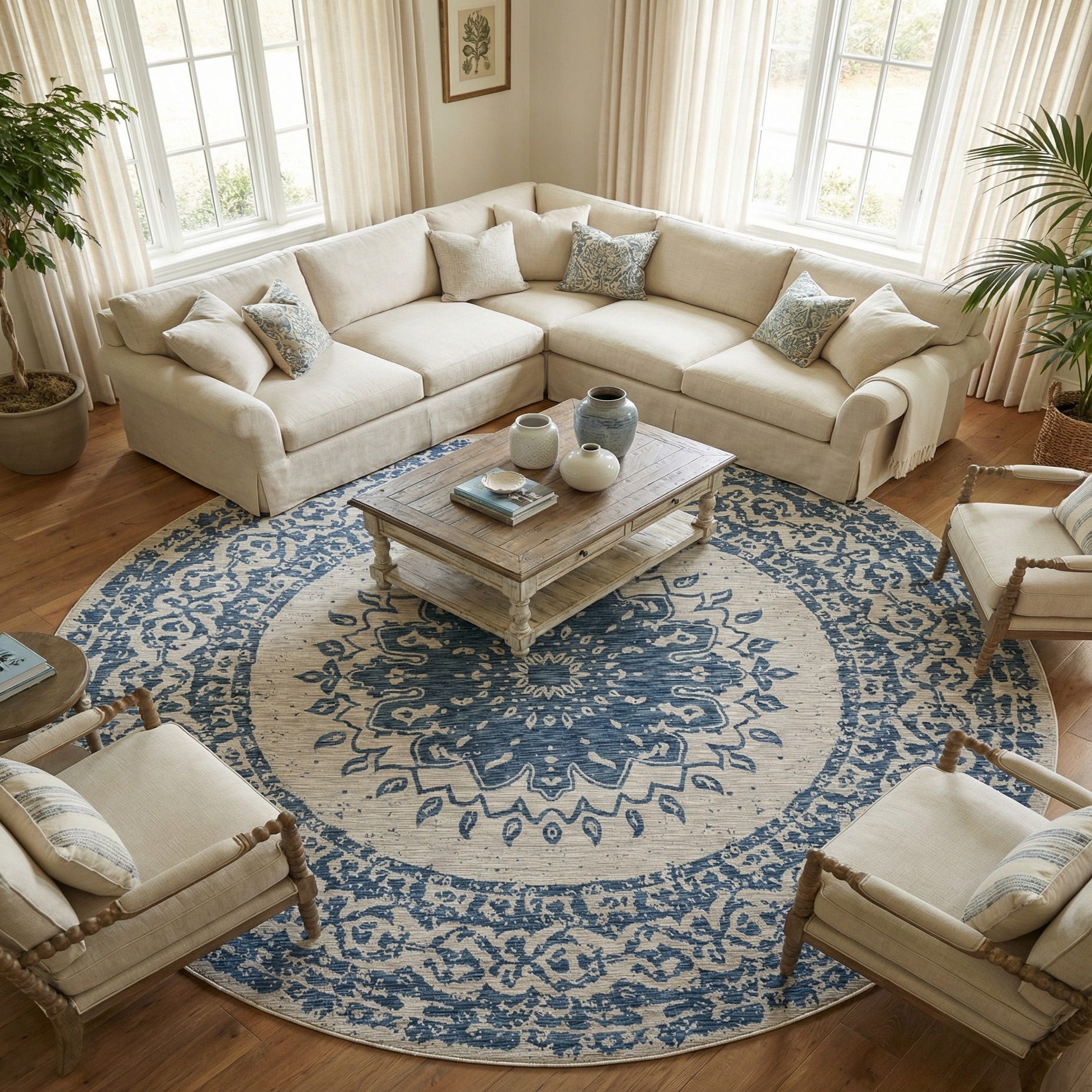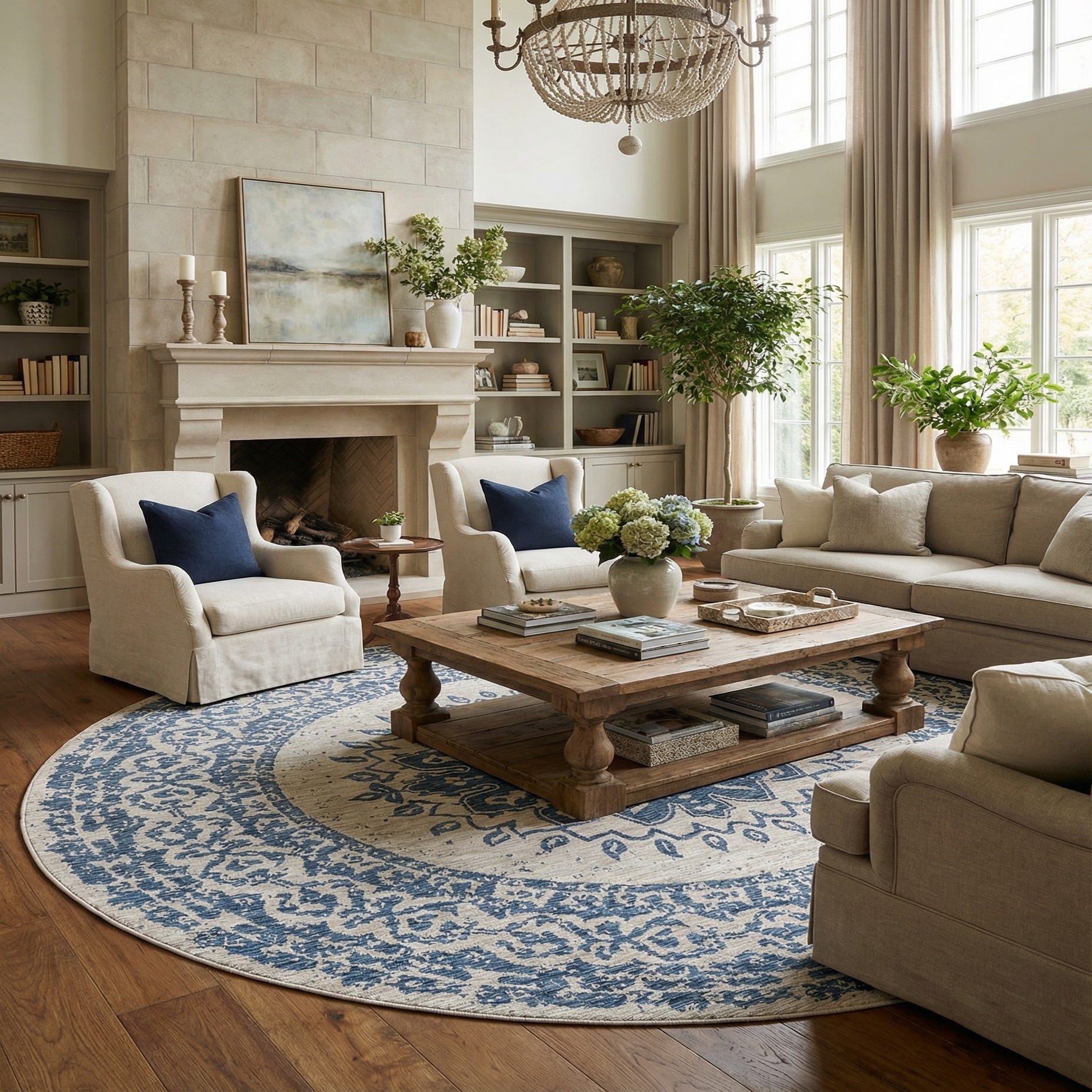 A large round blue and beige modern rug with a central medallion and intricate border pattern, suitable for indoor or outdoor use.