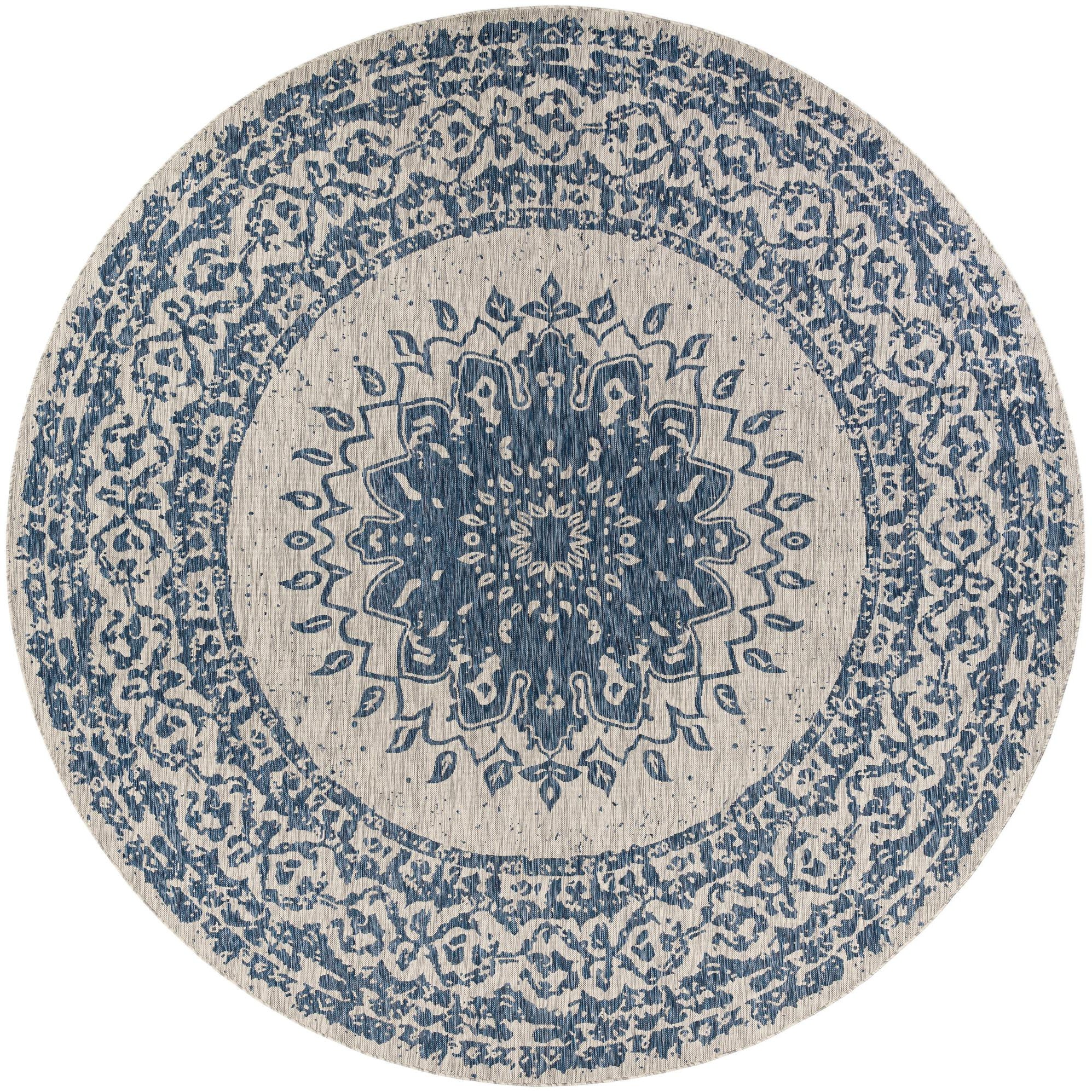 A large round blue and beige modern rug with a central medallion and intricate border pattern, suitable for indoor or outdoor use.