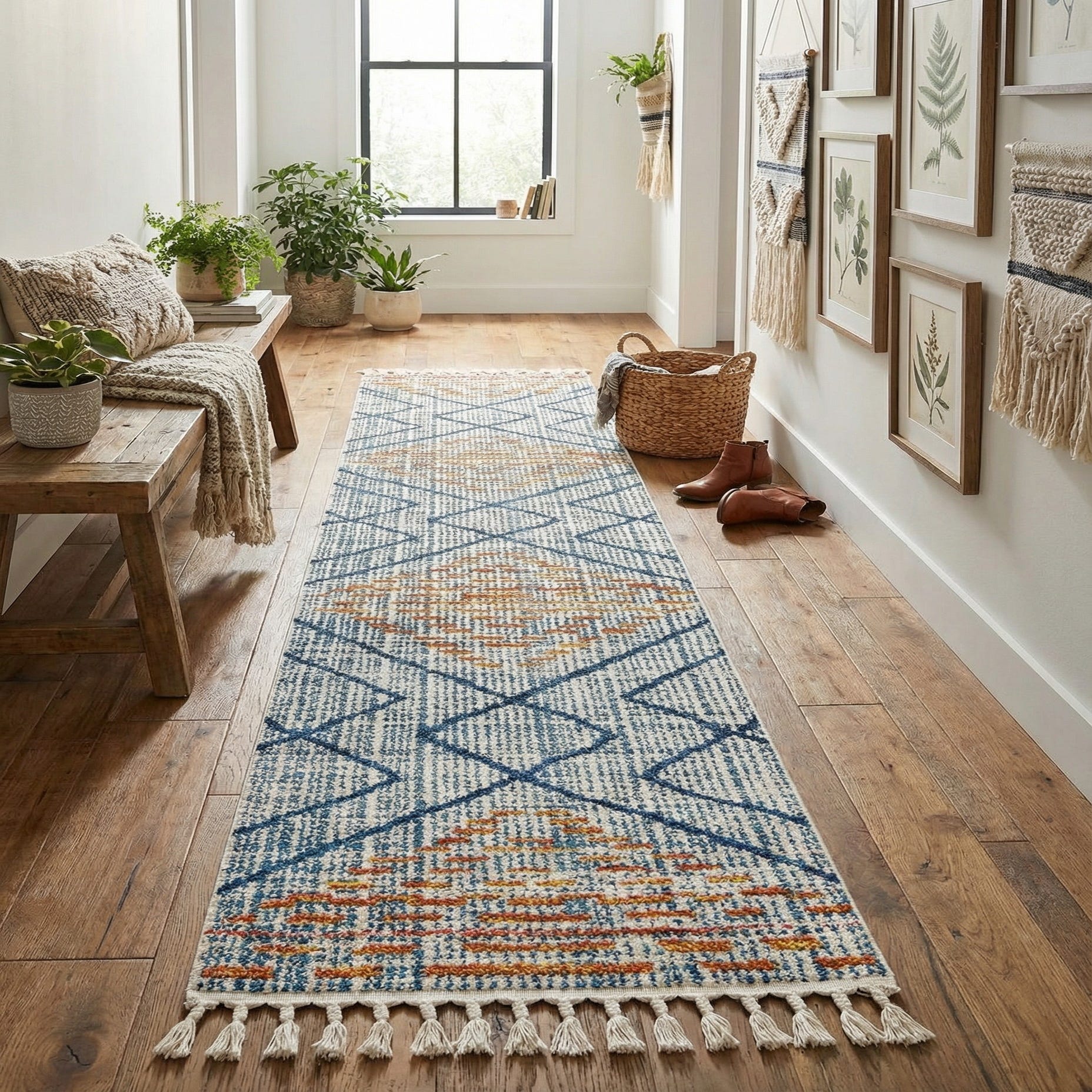 Well suited to hallways, entryways, or narrow kitchen aisles, this runner pairs nicely with warm wood floors, brass or black metal accents, and neutral upholstery. It complements coastal, modern farmhouse, and transitional interiors, and works especially well alongside navy seating, light-gray walls, or leather pieces when you want layered color and pattern without overpowering the room.