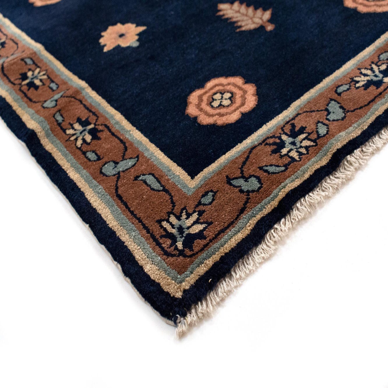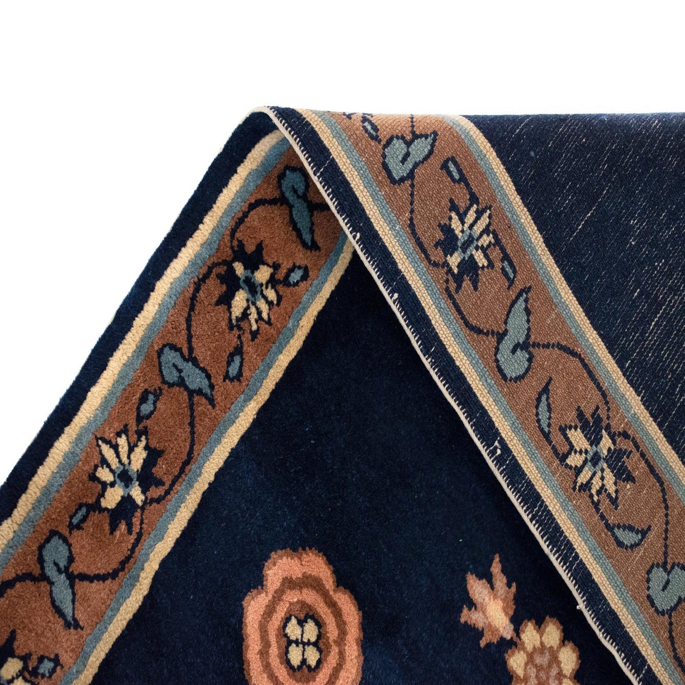 A 13 ft runner rug from the China Peking collection, featuring a deep blue field with scattered floral motifs and a detailed border in tan and light blue, ideal for a hallway.