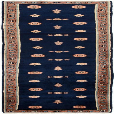 Primary color is Blue. Colors in this rug include: Blue, Beige, Brown, Dark Blue.