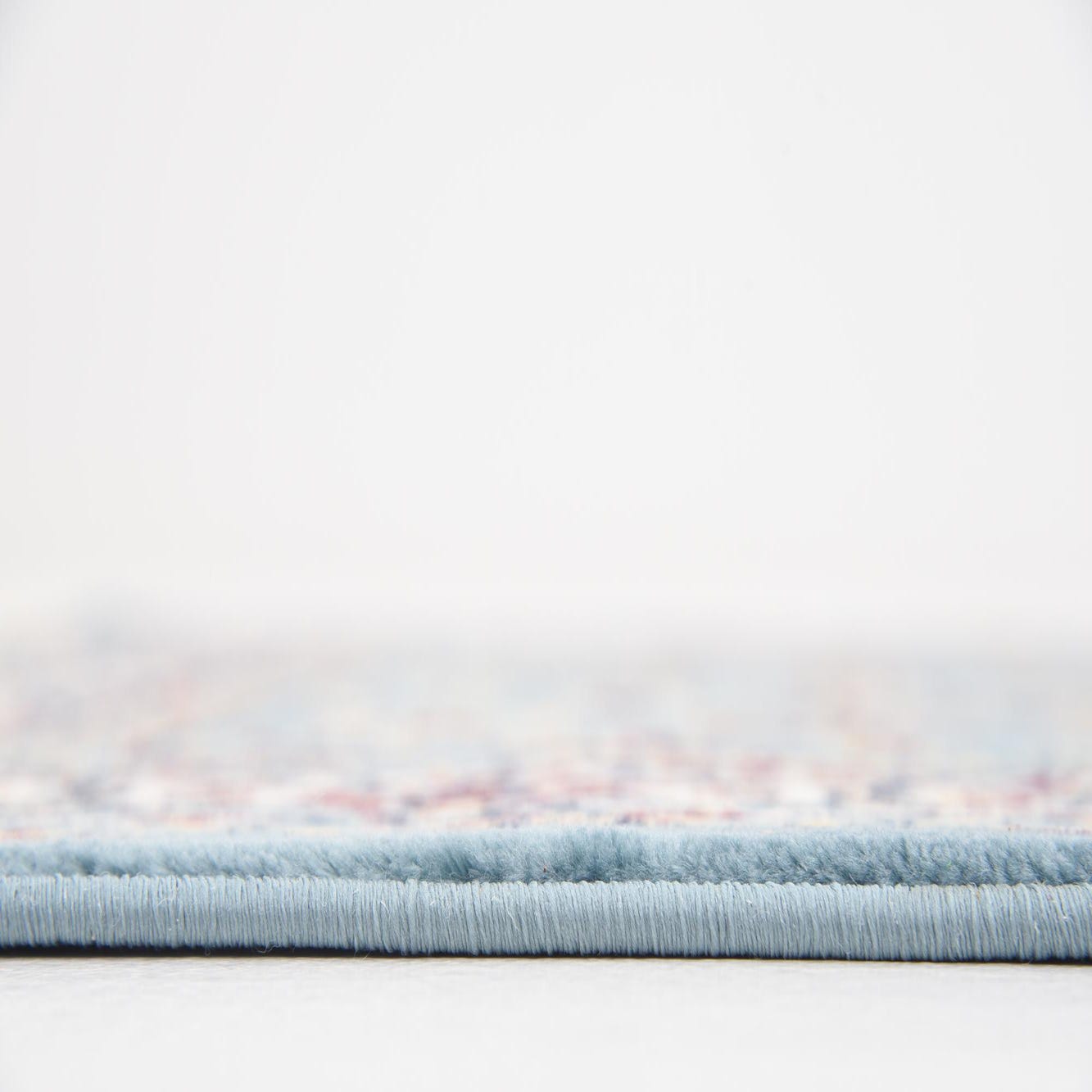 Primary color is Blue. Colors in this rug include: Blue, Burgundy, Cream, Light Blue, Light Green, Navy Blue, Puce.