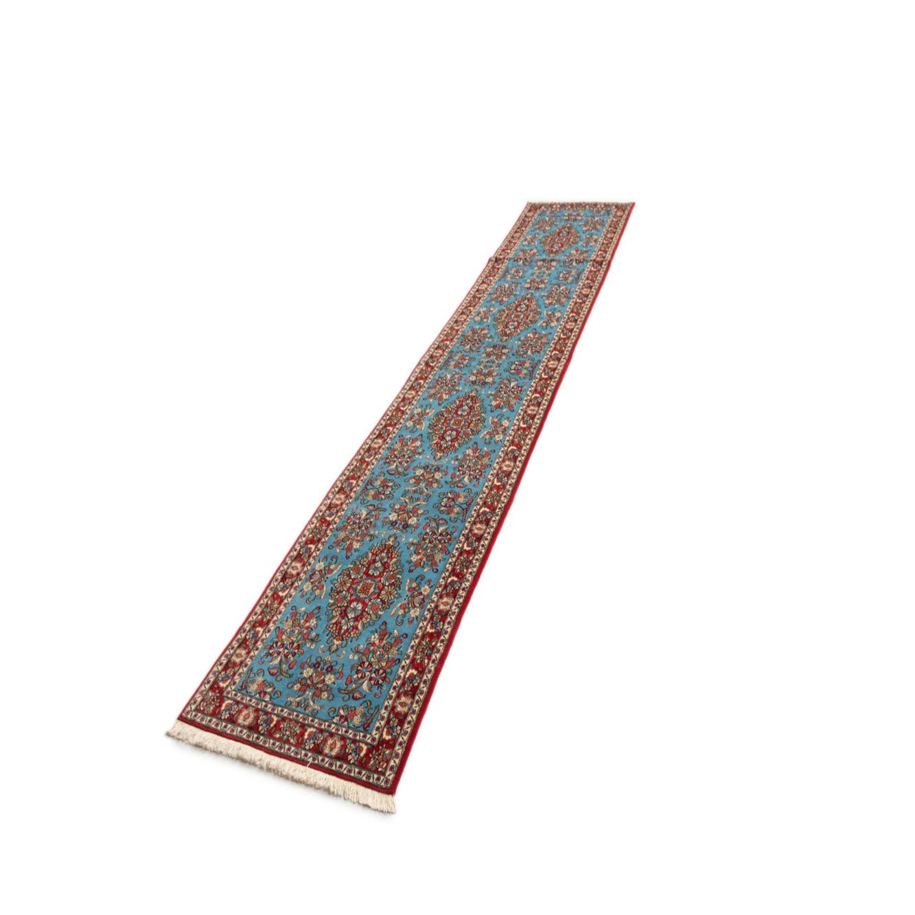 The Ghom collection proudly presents this hand-made wool 13-foot runner, an embodiment of craftsmanship and timeless appeal. The runner features a rich blue background, creating a deep canvas that brings its intricate pattern to the forefront. The design is composed of detailed floral and botanical motifs, arrayed in a symmetric layout that offers both harmony and visual interest. Lush reds and delicate accents of ivory, beige, and green are intertwined within these forms, providing a vibrant contrast that emphasizes the detailed artistry of the rug.